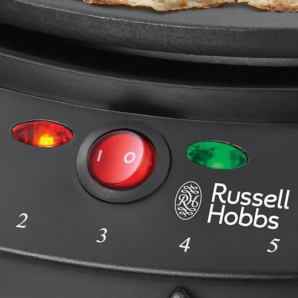 Crêpière électrique Russell Hobbs 30 cm, revêtement antiadhésif, thermostat 5 positions, 2 témoins lumineux, puissance jusqu’à 1200 W. Accessoires inclus : spatule et répartiteur. Patins antidérapants et rangement de cordon. Garantie 2 ans.