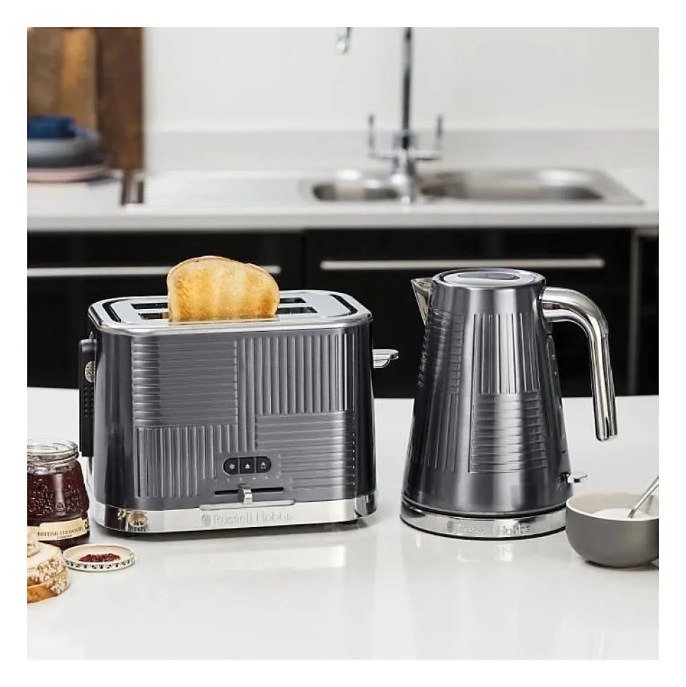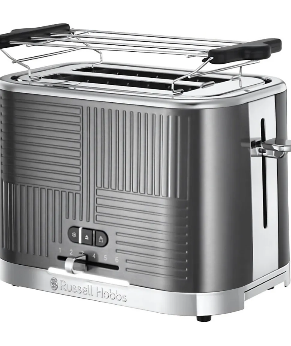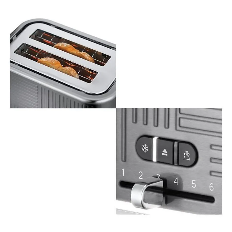 Russell Hobbs Geo Steel 25250-56, grille-pain deux tranches avec design géométrique moderne, acier inoxydable brossé, fonctions réchauffage, décongélation, annulation, large fentes pour pains épais, éclairage LED, puissance 2400W, tiroir ramasse-miettes amovible et pince incluse.