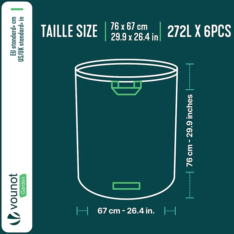 LES + PRODUITS Grande capacité de 272 L Résistants aux déchirures 3 poignées Facile d’utilisationDESCRIPTIONSACS DE JARDIN PLUS ÉPAIS ET PLUS RÉSISTANTSNos sacs déchets jardin sont fait en polypropylène durable et résistant (150gr/m2) et est anti-déchirure et résiste à l’humidité lorsque vous le remplissez avec de l’herbe ou de la terre mouillée.GRANDE CAPACITÉ DE RANGEMENTNotre sac de jardin a une capacité de 272 L qui peut supporter jusqu’à 80 kg d’herbes ou branches.RÉUTILISABLERamassez les feuilles et les déchets de votre jardin grâce à ce sac à déchets.FACILE À LEVER ET À VIDERLes 3 poignées situées sur les côtés permettent un transport et un vidage facile.MAINTENIR OUVERTLe cerclage plastique situé à l’ouverture du produit permet aux sacs de tenir debout et ouverts.CARACTÉRISTIQUES Taille : 67x76cm Capacité : 272 Litres/72 Gallons Matière : Polypropylène-150gr/m2► Attention : Attention de ne pas laisser les sacs de jardin exposé au soleil trop longtemps. Cela peut réduire la durée de vie du produit.► Conseil : Pour l’herbe tondue, les racines ou la terre mouillée, il est recommendé de ne remplir le sac qu’à moitié avec un poids raisonnable afin de ne pas vous faire mal au dos.IMPORTANT :Les livraisons se font en France métropolitaine à l’exception des îles qui ne sont pas reliées au continent par un pont (Corse, Ile d’Yeux etc.) et des DOM-TOM.