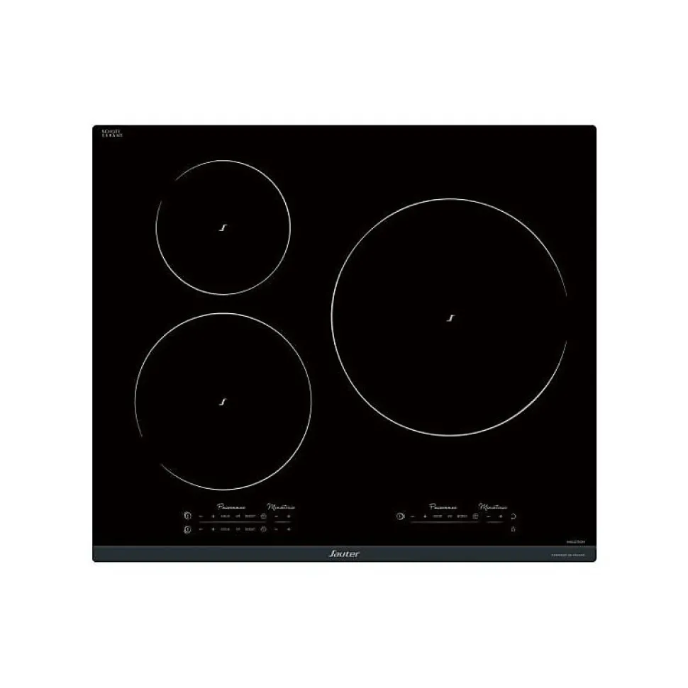 Plaque induction SAUTER SPI9544B, 3 foyers dont un grand de 28 cm (4000W), 13 niveaux de puissance avec Booster, fonctions Boil et Rappel, 10 niveaux de sécurité, commandes sensitives, design moderne avec avant biseauté, certifiée Origine France Garantie, garantie 2 ans constructeur.