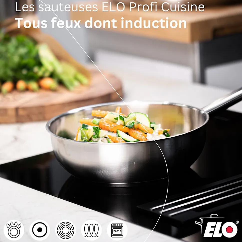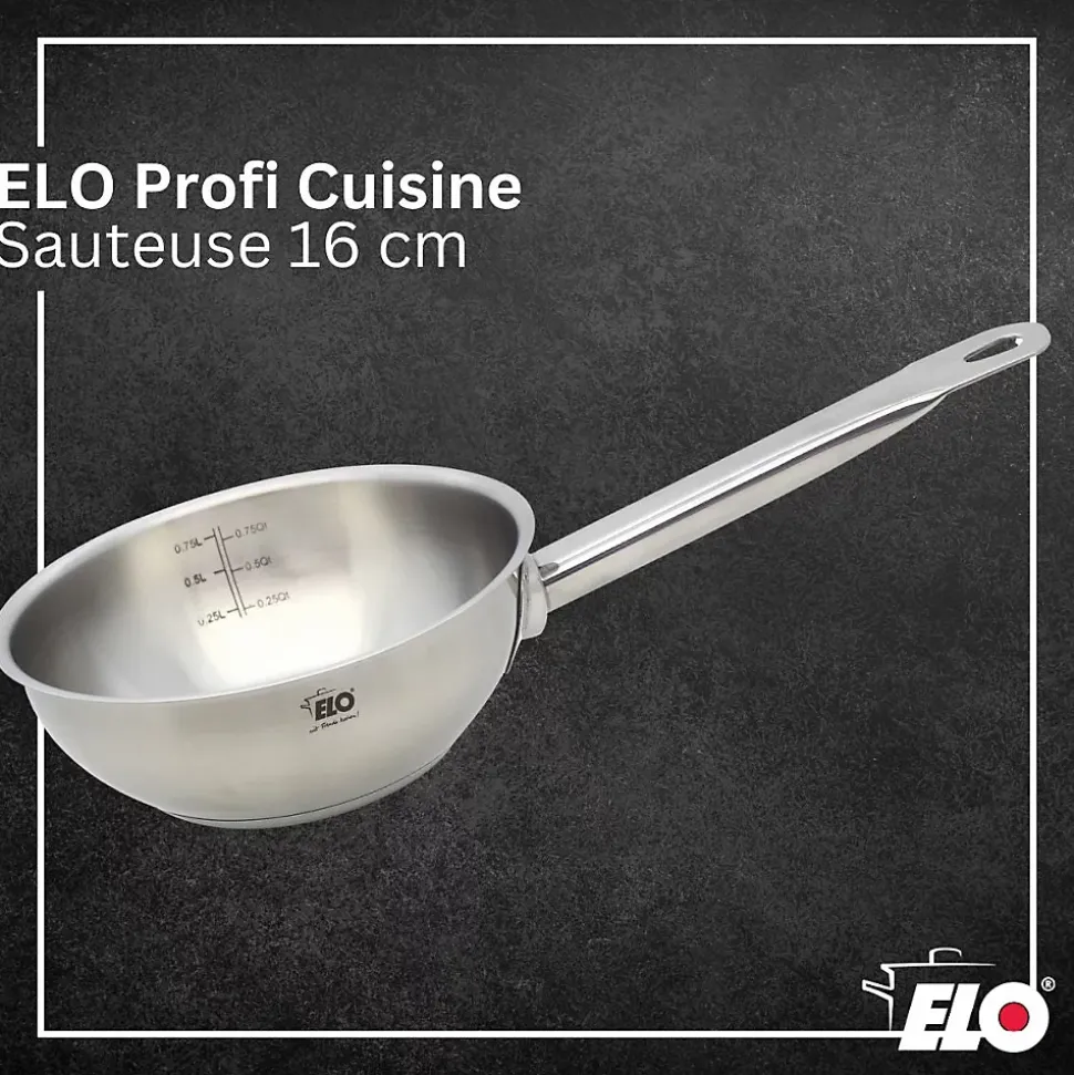 - DESCRIPTION: Sauteuse 16 cm en acier inoxydable 18/8 Elo Profi Cuisine, de haute qualité, pratique et polyvalente, tous feux dont induction et four jusque 240° C ; profonde et évasée, elle est le mix parfait entre un wok et une casserole