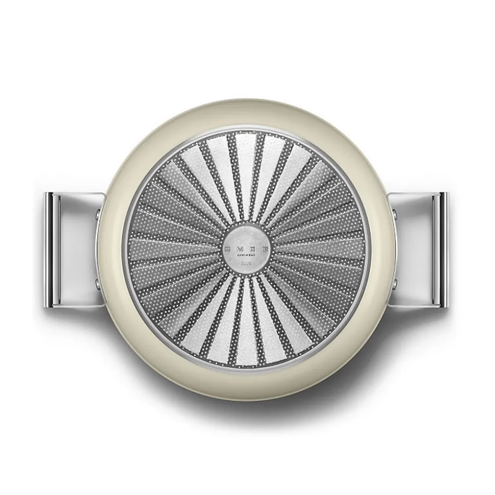 Sauteuse crème mat 28cm + couvercle Smeg – Sauteuse Années 50 DPF2812CRM de Smeg.Un allié précieux en cuisine : fabriqué en Italie avec un revêtement céramique sans PFAS, il est à la fois polyvalent et élégant. Sa forme et sa capacité le rendent également idéal pour la cuisson au four.Dimension disponible : 28 cm.Convient à tous les plans de cuisson et à tous les fours jusqu’à 250°C.Base radiante brevetée pour une distribution optimale de la chaleur.Les poignées en acier inox ont une forme large et ergonomique qui permet de saisir l’article confortablement et en toute sécurité.Revêtement céramique sans PFAS : la surface noire brillante et durable garantit des performances durables, un brunissement uniforme et un nettoyage facile. – Type de produit : Sauteuse.Esthétique : Années 50.Finition : Mat.Diamètre : 28 cm.Diamètre de contact du dessous : 220 mm.Volume : 4.3 l.Épaisseur de la base : 4.5 mm.Utilisable au four : Jusqu’à 250°C/480°F.Épaisseur du dessous en inox : 0,5 mm.Matériau du corps : Aluminium forgé à froid.Revêtement interne : Céramique antiadhésive.Couleur interne : Noir.Couleur du fond : Inox.Matériau de la base : Inox.Finition du bord : Largeur rectifiée.Type de poignée(s) : Poignées latérales.Couleur des poignée(s) : Inox.Matériau des poignée(s) : Inox AISI304.Finition des poignée(s) : Brillant.Couleur du couvercle : Transparent.Matériau du couvercle : Verre trempé avec bord en inox.Forme du couvercle : Plat.Trou d’aération du couvercle : Oui.Couleur de la anse : Inox.Matériau de la anse : Inox.Finition Anse : Brillant.Fixation poignée(s) : Oui.Fixation poignée(s) : Rivetée.Surfaces de cuisson compatibles : Induction, Gaz, Vitrocéramique, Electrique.Lavable au lave-vaisselle : Oui.Couvercle lavable au lave-vaisselle : Oui.Sans métaux lourds :