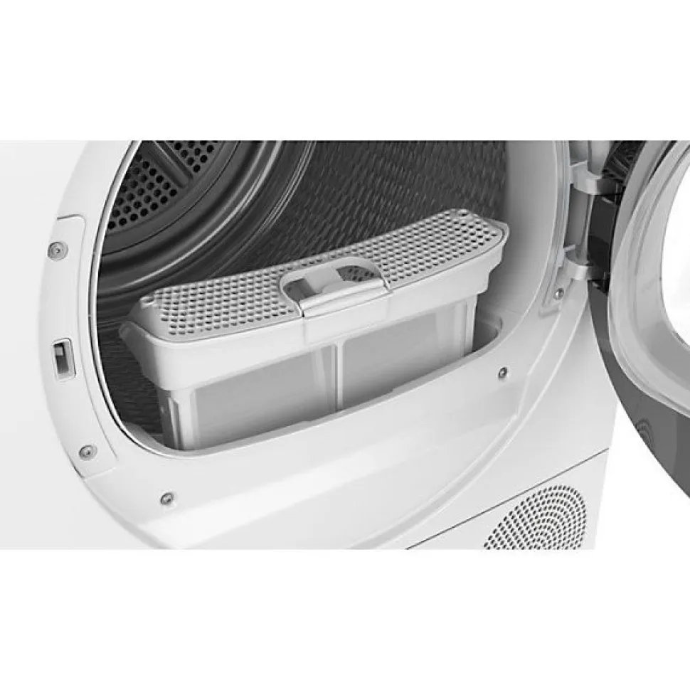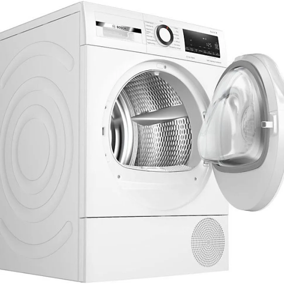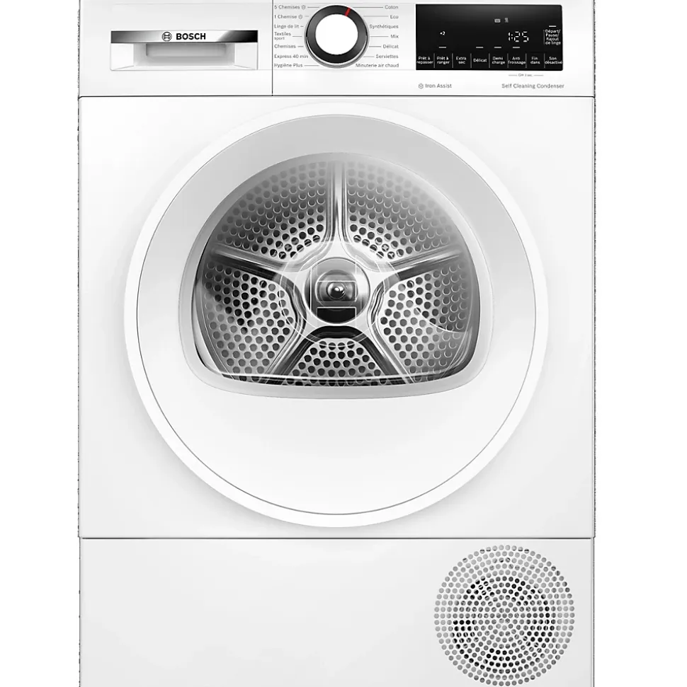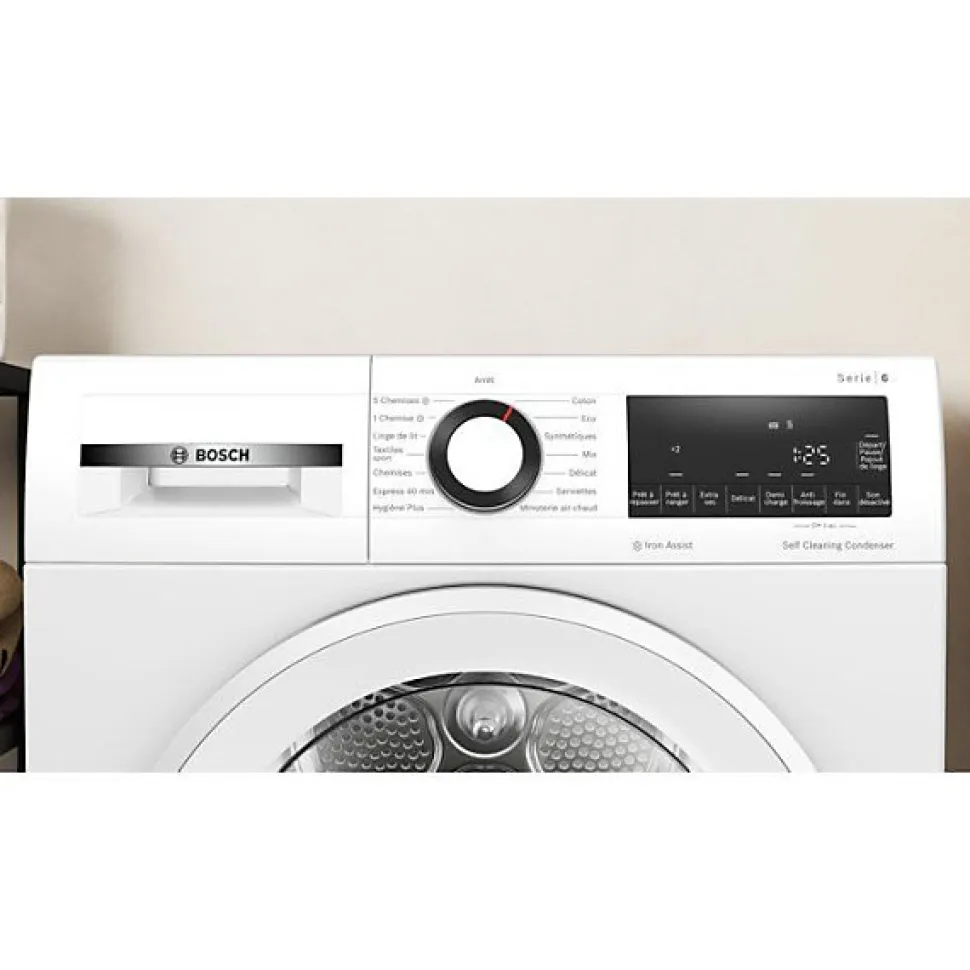 Sèche-linge pompe à chaleur 60cm 9kg Bosch – Sèche-linge pompe Série 6 WQG24502FR de BoschCondenseur à nettoyage automatique des peluches.Les sèche-linge à pompe à chaleur dotés d’un condenseur auto-nettoyant protègent vos vêtements et restent très économes en énergie. Grâce à la technologie Self Cleaning Condenser, le condenseur est nettoyé automatiquement jusqu’à quatre fois pendant le processus de séchage, ce qui maintient des performances énergétiques optimales cycle après cycle. Les sèche-linge à pompe à chaleur de Bosch sont conçus pour fonctionner efficacement tout en séchant délicatement vos vêtements.Détecte automatiquement quand votre linge est sec.Chargez jusqu’à 10 kg de vêtements dans votre sèche-linge ou lave-linge séchant doté de la technologie AutoDry. Il les séchera précisément jusqu’au degré souhaité : juste assez sec pour être repassé ou extra sec et prêt à ranger. Des capteurs mesurent en permanence la température et l’humidité à l’intérieur du tambour pour protéger votre linge de tout séchage excessif. Obtenez ainsi un séchage toujours impeccable.Réduisez jusqu’à 50% des plis et minimisez votre pile de linge à repasser.Iron Assist pulvérise de l’eau dans le tambour pour créer une brume d’eau chaude. Cela aide à défroisser votre linge. Certains articles n’auront même pas besoin d’être repassés. C’est parfait pour les vestes et les chemises.Paramètres optimisés pour les petites charges.Option demi-charge : optez pour le programme le mieux adapté aux petites charges (poids et durée). – Type de produit : Sèche-linge.Type d’installation : Pose-libre.Capacité maximale : 9.0 kg.Puissance de raccordement : 800 W.Niveau sonore : 64 dB (A) re 1 pW.Classe d’efficacité sonore : B.Classe d’efficacité énergétique : E.Classe d’efficacité de condensation : C.Consommation d’énergie pondérée par cycle (UE 2017/1369) : 1.44kWh/cycle.Consommation énergétique pondérée pour