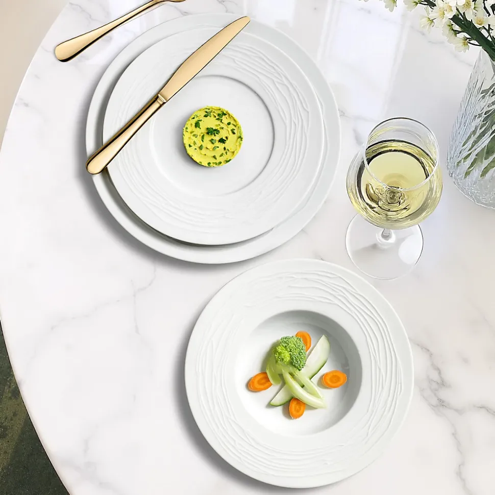 Ensemble de 6 assiettes plates, 6 assiettes dessert et 6 assiettes salade et pâtes de la collection Lago par Médard de Noblat. La collection Lago se distingue par ses lignes irrégulières et en relief qui ornent avec raffinement l’aile large de chaque assiette. Son design subtil et élégant s’intègre parfaitement aux ambiances chic et modernes. Médard de Noblat perpétue un savoir-faire et une tradition de qualité depuis 1836. Notre vaisselle de porcelaines et de grès créé des univers actuels et raffinés, entre rigueur et exubérance, pour un quotidien hors norme. Dimensions Assiette plate 27 cm, assiette dessert 23 cm, assiette salade et pâtes 23 cm