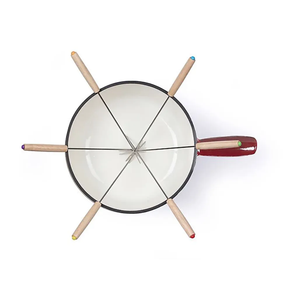 Service à fondue traditionnel de 2,6 L pour 6 personnes. Poêlon en fonte émaillée, compatible tous feux, idéal pour fondues au fromage, à la viande ou chinoises. Inclus : réchaud, brûleur et 6 fourchettes avec manches en bois. Dimensions : 32 x 22.2 x 9 cm, poids : 5.02 kg.