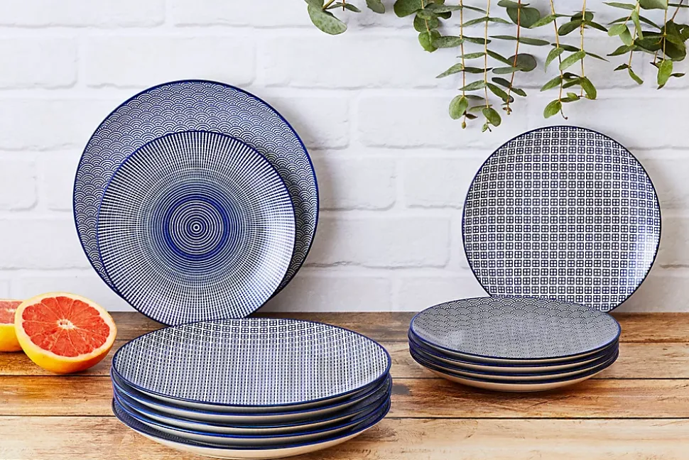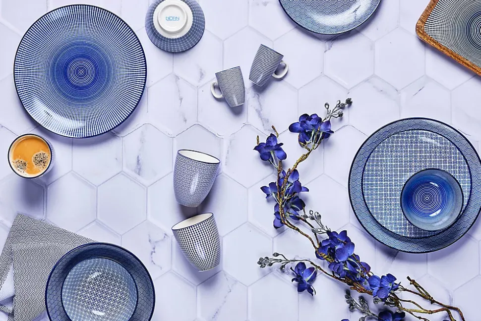 Le service Les Essentiels est constitué des 3 basiques pour 6 personnes, à savoir un bol, une grande et une petite assiette. L’assortiment est judicieusement dépareillé pour permettre un dressage de table facile, originale et harmonieux.Fabriqué à partir d’une porcelaine emaillée haut de gamme et ultra résistante, une machine importée du japon est utilisée pour apposer les motifs colorés, tandis que les bordures et certains détails sont peints à la main avant la cuisson à 1200°C.La collection PATTERN dans sa déclinaison Dark Blue sollicite votre créativité et permet un mix and match facile des couleurs lors du dressage de la talbe. Les motifs et les couleurs tournent d’une pièce à l’autre et nous invitent à l’échange et au partage.