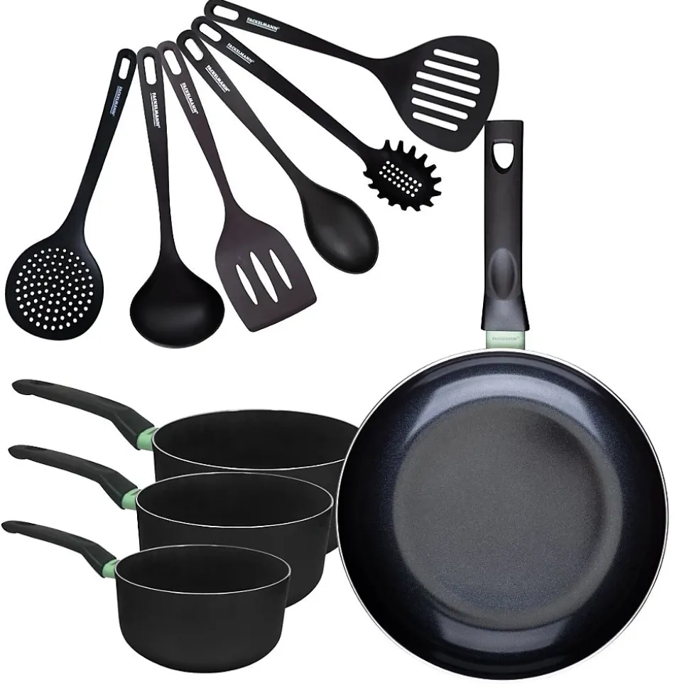 - DESCRIPTION: Batterie Fackelmann Brandao avec 1 poêle de 30 cm, 3 casseroles de 16 à 20 cm en aluminium recyclé avec revêtement céramique antiadhésif, et 6 ustensiles en RPET noir