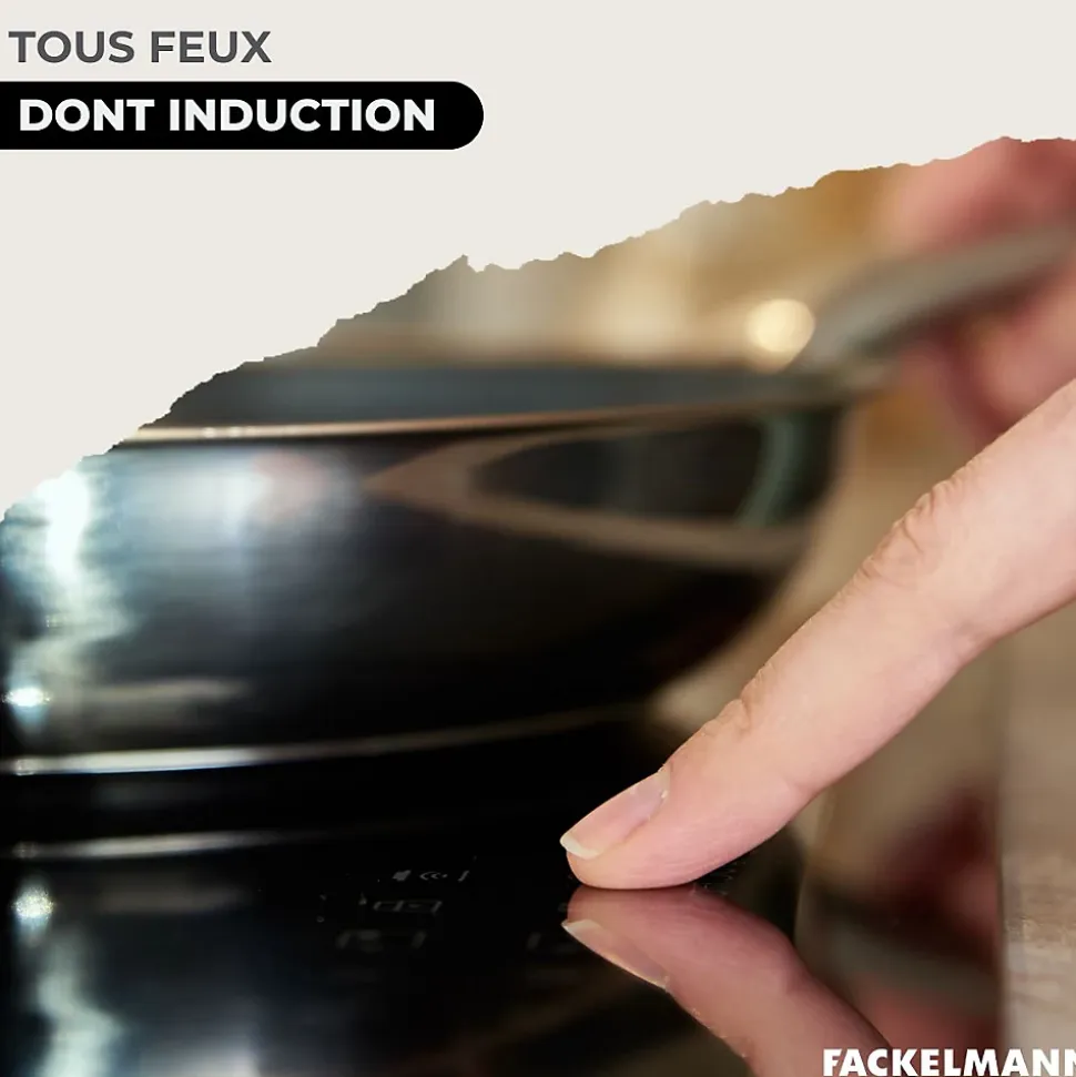 DESCRIPTION: Set de 2 poêles de 20 et 28 cm en inox 18/8 et six ustensiles de cuisine et de service en RPETPETIT +: Cet ensemble vous offre tout le nécessaire pour préparer et le servir vos plats pour 1 à 5 personnesCOMPOSITION: Poêles en inox 18/8 ; ustensiles en plastique recyclé, un matériau léger et résistant jusqu’à 210°CDIMENSIONS: Poêle 20 cm Hauteur 4,5 cm Fond 14,5 cm Manche 16,5 cm ; Poêle 28 cm Hauteur 5,5 cm Fond 20 cm Manche 19 cm ; ustensiles de 29,5 à 31,5 cm de longUTILISATION: Poêles adaptées à tous types de feux, y compris induction, et passe au four jusqu’à 200°C ; ustensiles adaptés pour la cuisson et le serviceENTRETIEN: Poêles nécessitent un culottage, et passent au lave-vaisselle comme les ustensiles pour un nettoyage simplifiéCette batterie de cuisine de haute qualité Fackelmann Eterna comprend une poêle de 20 cm idéale pour 1 à 2 personnes, et une de 28 cm parfaite pour 4 à 5 convives.Compatibles avec tous les types de feux, y compris induction et four jusqu’à 200°C, les poêles sont conçues pour résister aux rayures et à la corrosion.Ces poêles à frire en inox 18/8 sans PFAS avec un noyau en aluminium léger assurent une cuisson saine, une excellente conduction thermique et une répartition homogène de la chaleur. Le manche tube en inox riveté offre une prise en main solide et sécurisée.Ajoutez à cela une louche, une pelle, une cuillère, une écumoire et une cuillère à spaghetti en plastique recyclé noir, pratiques et résistants, pour servir vos plats favoris.Un ensemble qui allie qualité, fonctionnalité et style. Les poêles de cuisson sont compatibles avec le lave-vaisselle.Elles nécessitent un culottage avant la première utilisation pour une performance optimale.Induction : le diamètre du fond du récipient doit est égal au diamètre de la zone de cuisson, sinon la plaque peut ne pas le reconnaître.