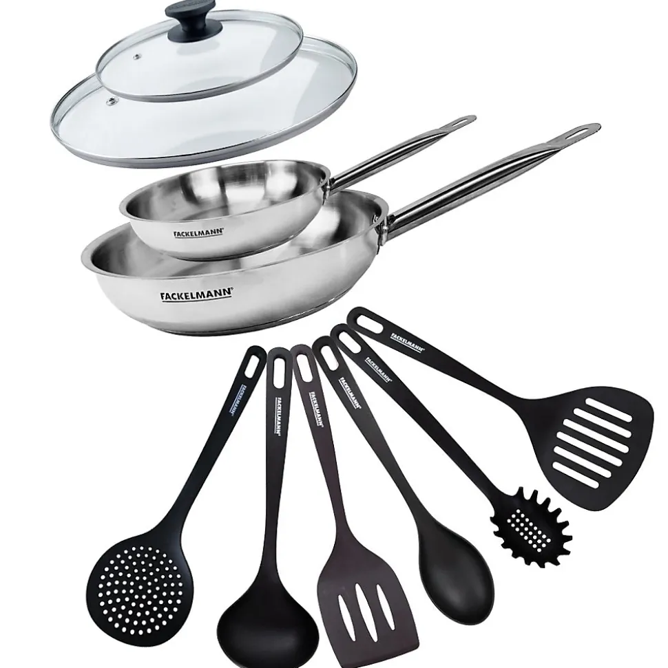 - DESCRIPTION: Ensemble de 2 poêles Fackelmann Eterna de 20 cm et 28 cm en inox 18/8, 2 couvercles adaptés, et 6 ustensiles en RPET