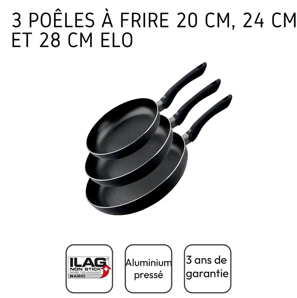 - DESCRIPTION : Elo vous propose ce set de 3 poêles à frire de 20, 24 et 28 cm de diamètre parfaites pour faire revenir votre viande ou votre portion de légumes sans surplus de matière grasse grâce à son revêtement anti-adhérant et son fond en nid d’abeille