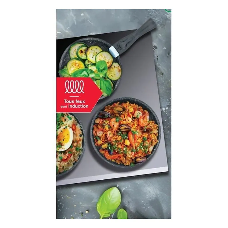 - Poêles de trois tailles différentes (20 cm, 24 cm et 26 cm) pour une utilisation polyvalente