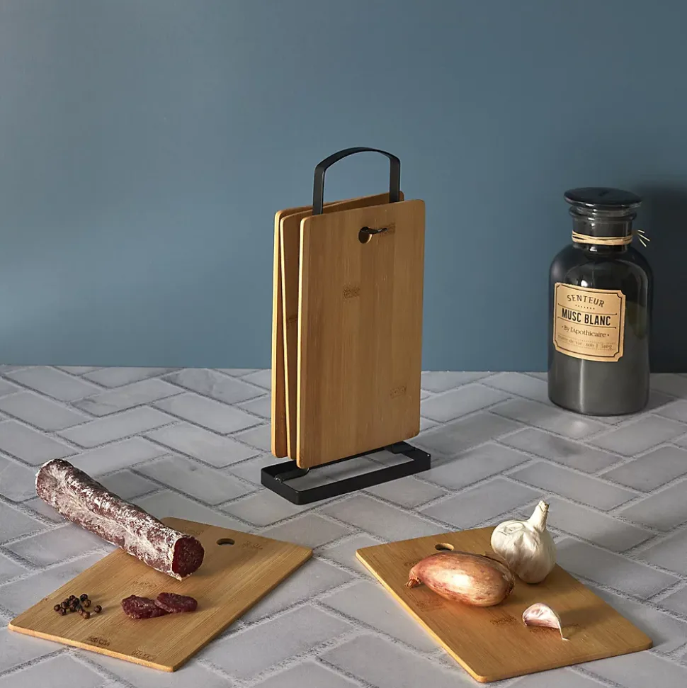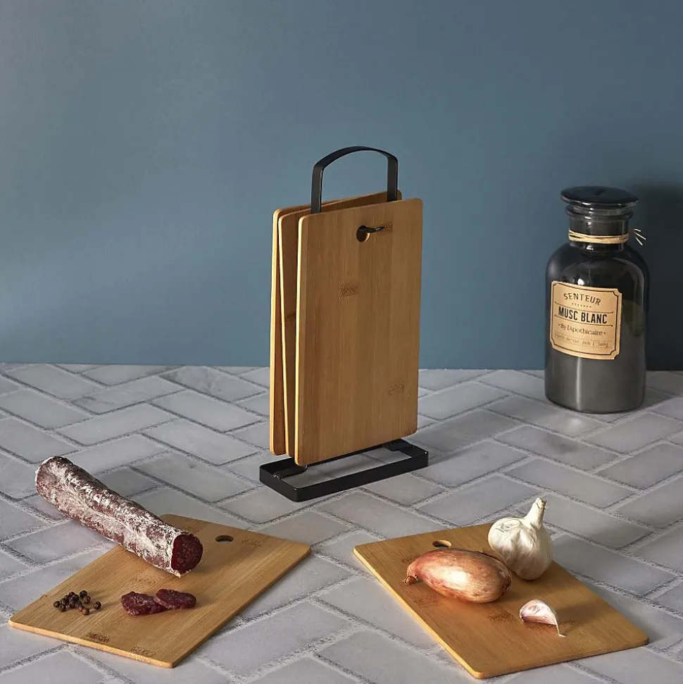 Aspect : Coloris = Noir • Matériau principal = Bambou • Matériaux secondaires = Métal • Dimensions avec socle : Hauteur (en cm) = 30 • Longueur (en cm) = 16 • Profondeur (en cm) = 5 • Autres caractéristiques : Dimension des planches = 22 x 14 cm (L x l) • Informations complémentaires = Set de 6 planches à découper avec socle • Poids (en kg) = 0,77 • Set de 6 planches à découper en bambou avec socle en métal
