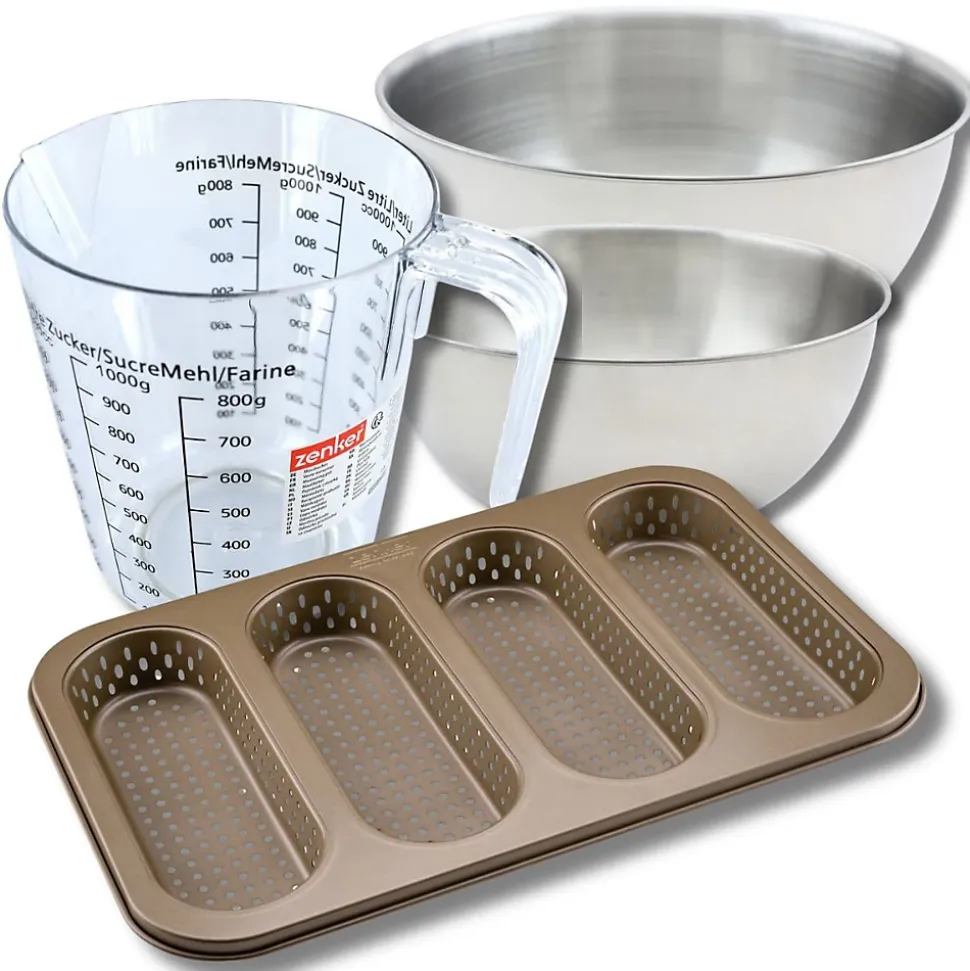 DESCRIPTION: Ensemble d’ustensiles comprenant un moule à pain, deux bols à mixer, une spatule et un verre doseur pour toutes vos recettesPETIT +: La combinaison de ces ustensiles facilite la préparation, la cuisson et la mesure de vos ingrédientsCOMPOSITION: Moule en acier avec revêtement antiadhésif, bols en acier inoxydable, spatule en plastique et silicone, verre en plastiqueDIMENSIONS: Moule 33,5 x 22 x 3 cm, bol 25 cm, bol 20,5 cm, spatule 25 cm, verre 17 x 15,5 x 11,7 cmUTILISATION: Cuisson de mini baguettes, préparation de pâtisseries, mélange d’ingrédients, et mesures précisesENTRETIEN: Moule à nettoyer à la main, bols et spatule à laver à la main, verre à rincer à l’eauDécouvrez notre set d’ustensiles de pâtisserie, parfait pour réaliser des pains croustillants. Le moule à 4 mini baguettes Zenker Mojave Gold (18 x 6,2 cm chacune) est conçu pour cuire vos pains maison : perforé, il évacue l’humidité pour des baguettes croustillantes et aussi bonnes qu’en boulangerie. Parfait aussi pour décongeler ou réchauffer du pain, ou cuire des baguettes viennoises, brioches, pains au lait ou pains à hamburger.Démoulage facile grâce au revêtement antiadhésif en ILAG Special. Le moule fabriqué en Allemagne est garanti 5 ans ; il résiste au four jusqu’à 230°CAjoutez à cela deux bols à mixer en inox, de 25 cm et 20,5 cm, qui facilitent vos préparations. Complétez votre expérience avec une spatule en silicone Zenker pour racler vos bols, et un verre doseur de 1 litre Zenker pour des mesures précises. Tous ces outils se complètent pour une expérience culinaire optimale.