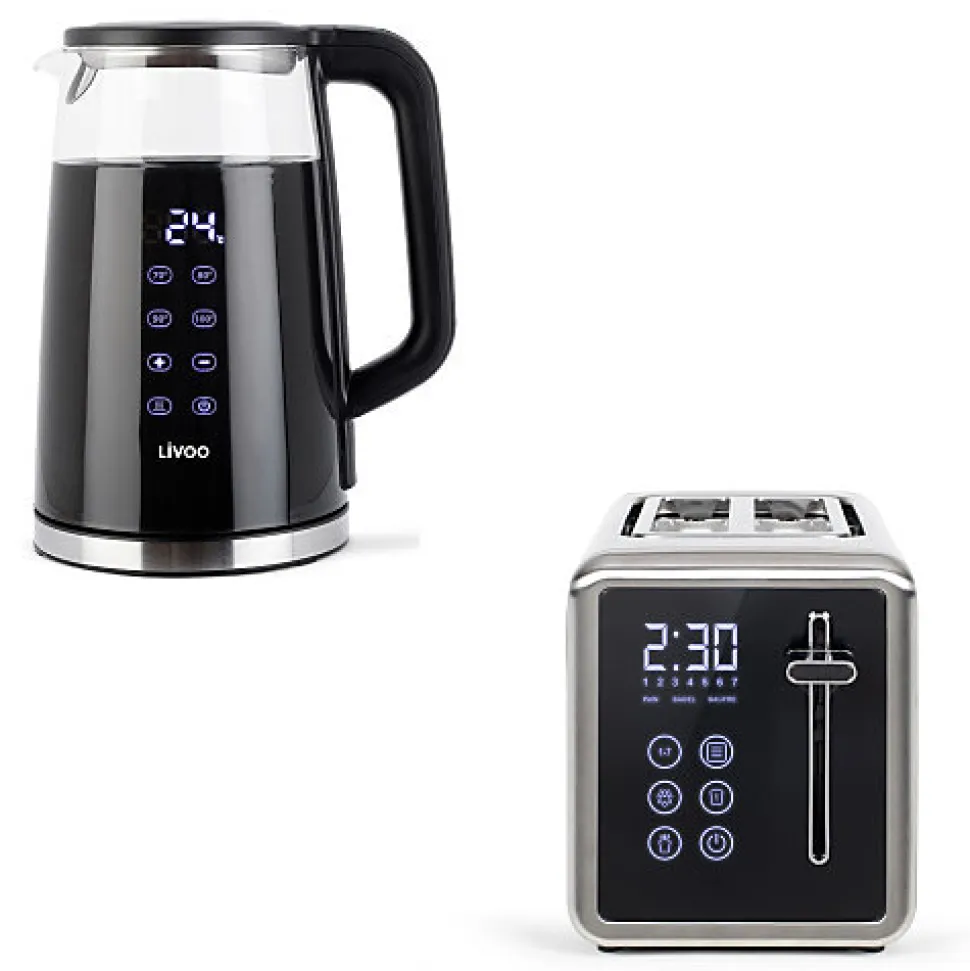PING vous propose :Un set spécial pour petit déjeuner avec une touche déco résolument moderne.Si vous voulez combiner le pratique et la déco alors ce set d’accessoires de cuisine « petit déjeuner » est fait pour vous.Avec son style affirmé totalement high tech, vous donnerez une note esthétique 21ème siècle stylisée et conviviale à votre cuisine. Tout aussi pratique que déco pour préparer votre thé et votre café, la bouilloire électrique sans fil dispose d’une capacité de 1.7 L et d’un indicateur de niveau d’eau. Cette bouilloire se coupe grâce à un arrêt automatique. Posée sur une base pivotante à 360°, elle est facile à manipuler.Vous pourrez obtenir eau eau épurée car elle dispose d’un filtre anticalcaire amovible et lavable.D’autre part, pas de risque de se brûler, grâce à sa poignée cool touch et pas non plus de risque de chauffage à vide, grâce à sa protection anti-chauffe à sec.Quant au grille-pain, celui-ci dispose de 2 larges fentes (3.5 cm) pour toute sorte de pain. qui vous indique sur quel mode vous êtes : décongélation, réchauffage ou annulation.D’autre part, son ther
