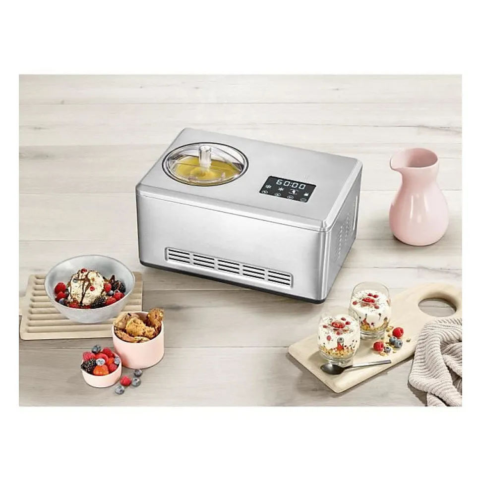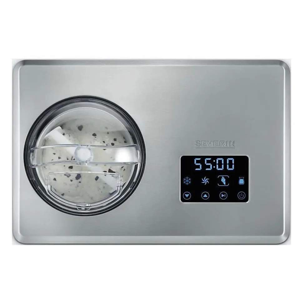 Sorbetière 2 en 1 innovante SEVERIN EZ7405 associant glace, sorbet et yaourt glacé. Puissance 180 W, capacité 2 litres, facile à utiliser grâce à son écran tactile LED et sa minuterie intégrée. Boîtier en inox brossé robuste et élégant. Cuve amovible compatible lave-vaisselle. Préparation rapide en moins de 30 minutes sans besoin de pré-congélation, avec refroidissement actif par compresseur.