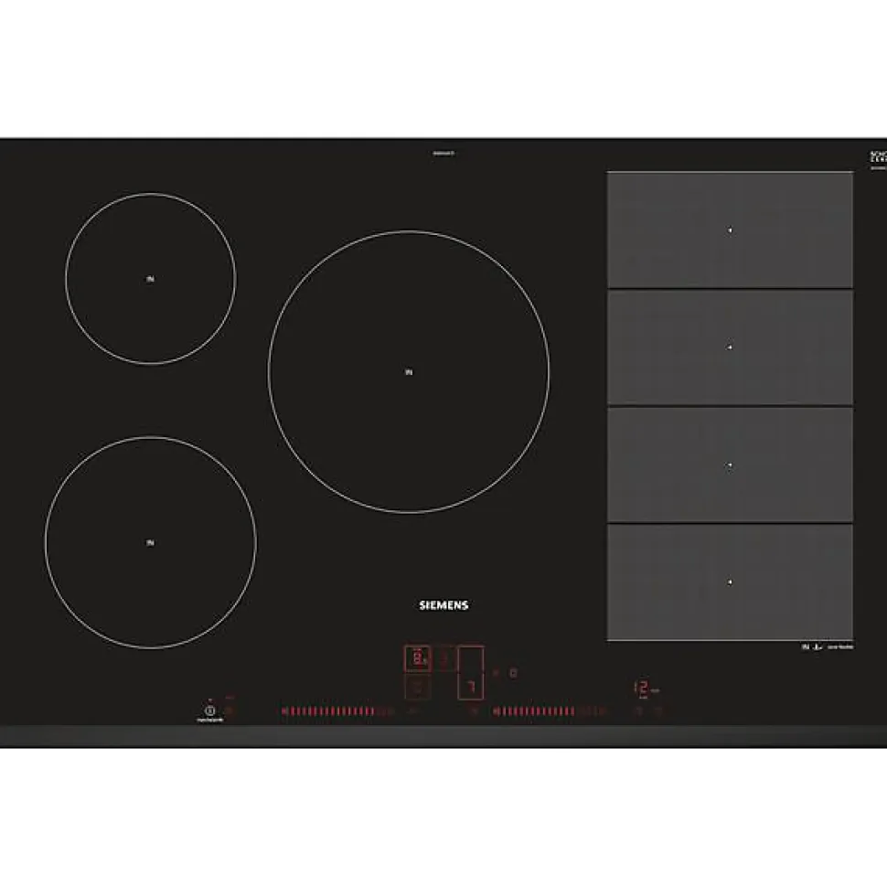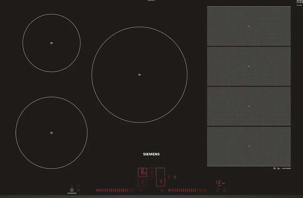 Table de cuisson induction 80cm 4 feux 7400w noir Siemens – Table de cuisson induction iQ700 Siemens EX851LVC1F bords biseautés. Table à induction avec de nouvelles fonctions innovantes, pour une grande flexibilité en toute situation. Cuisson flexible grâce à l’innovation flexInduction et les 3 zones de cuisson traditionnelles. powerMove Plus permet un contrôle intuitif grâce à trois zones de cuisson prédéfinies avec des températures différentes. fryingSensor : maintient automatiquement la température désirée de la poêle. Aucun risque de brûler les aliments. Bandeau dual lightSlider, pour un contrôle facile et intuitif de la table. Grâce à la fonction powerBoost, le temps de préchauffage est jusqu’à 50% plus rapide.Design :- Affichage digital.- Commande dual lightSlider.Puissance :- 5 foyers induction dont 1 zone de cuisson flexInduction (zone libre équipée de 4 inducteurs ovales).- Zones de cuisson : 1 x Ø 180 mm, 1.8 kW (powerBoost 3.1 kW), 1 x Ø 145 mm, 1.4 kW (powerBoost 2.2 kW), 1 x Ø 240 mm, 2.2 kW (powerBoost 3.7 kW), 1 x Ø 400 mm x 210 mm, 3.3 kW (powerBoost 3.7 kW) ou 2 x Ø 200 mm, 2.2 kW (powerBoost 3.7 kW).Confort/Sécurité :- fryingSensor Plus : capteur de température pour les poêles.- Fonction quickStart : détection automatique des récipients sur la zone de cuisson.- Fonction reStart : en cas d’arrêt brutal de la table, mémorisation de la température initiale pendant 4 secondes.- powerMove Plus : 3 puissances prédéfinies.- Affichage de la consommation énergétique.- 17 positions de réglage.- PowerBoost sur chaque foyer.- PanBoost : booster spécial pour les poêles.- Timer sur chaque foyer.- Témoin de chaleur résiduelle à 2 niveaux.- Touche nettoyage : possibilité de bloquer le bandeau de commande pendant 20 secondes afin de nettoyer la table en cas de débordement. – Groupe de produit : Table de cuisson.Appellation produit/famille : Foyer en vitrocéramique.Type de construction : Intégrable.Type de commandes : Electronique.Système de