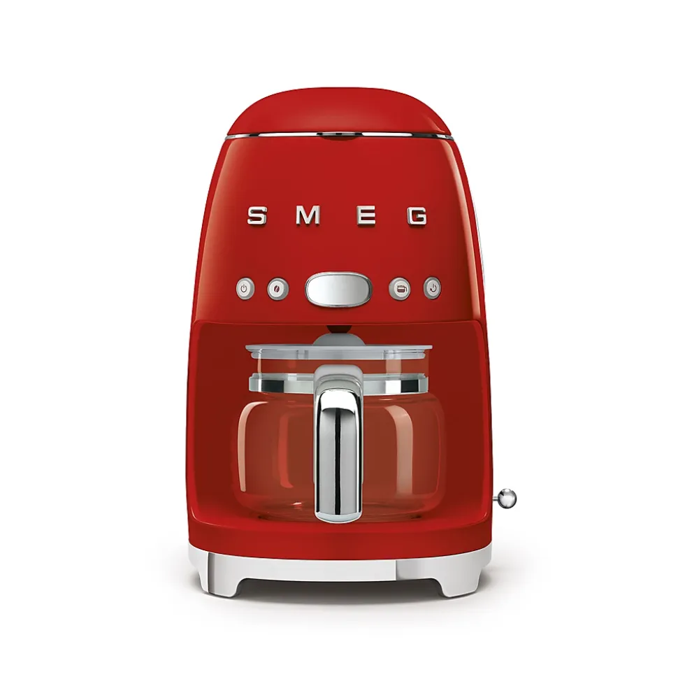 Machine à café filtre Smeg DCF02RDEU allie design rétro élégant et performance moderne avec 1050 W de puissance, réservoir de 1,4 L, carafe en verre de 1,25 L (10 tasses), écran LED programmable, sélecteur d’arômes et système anti-gouttes.