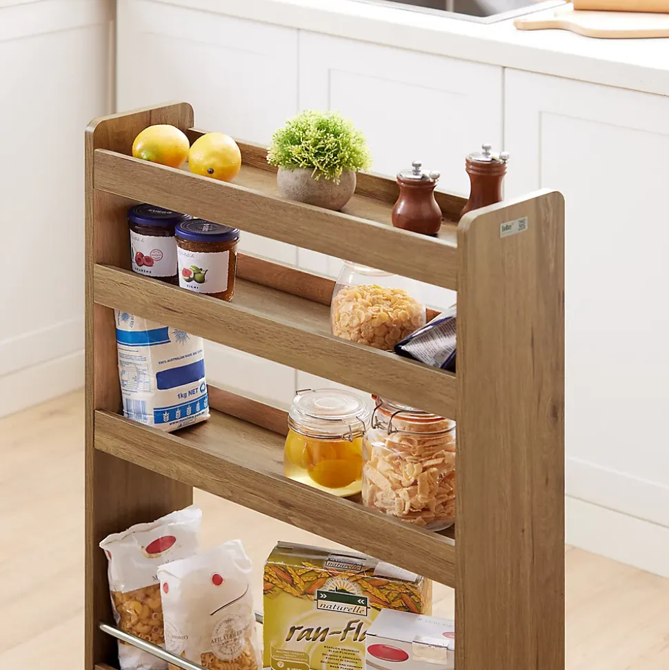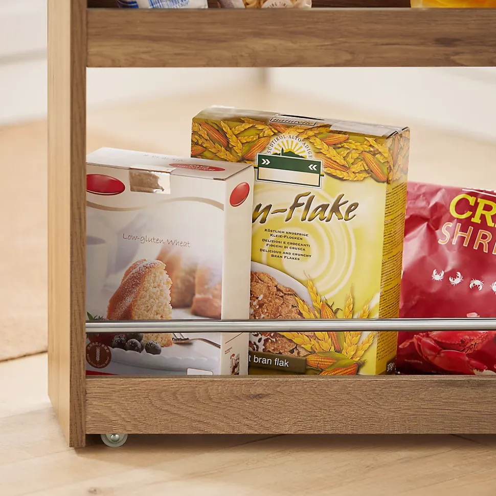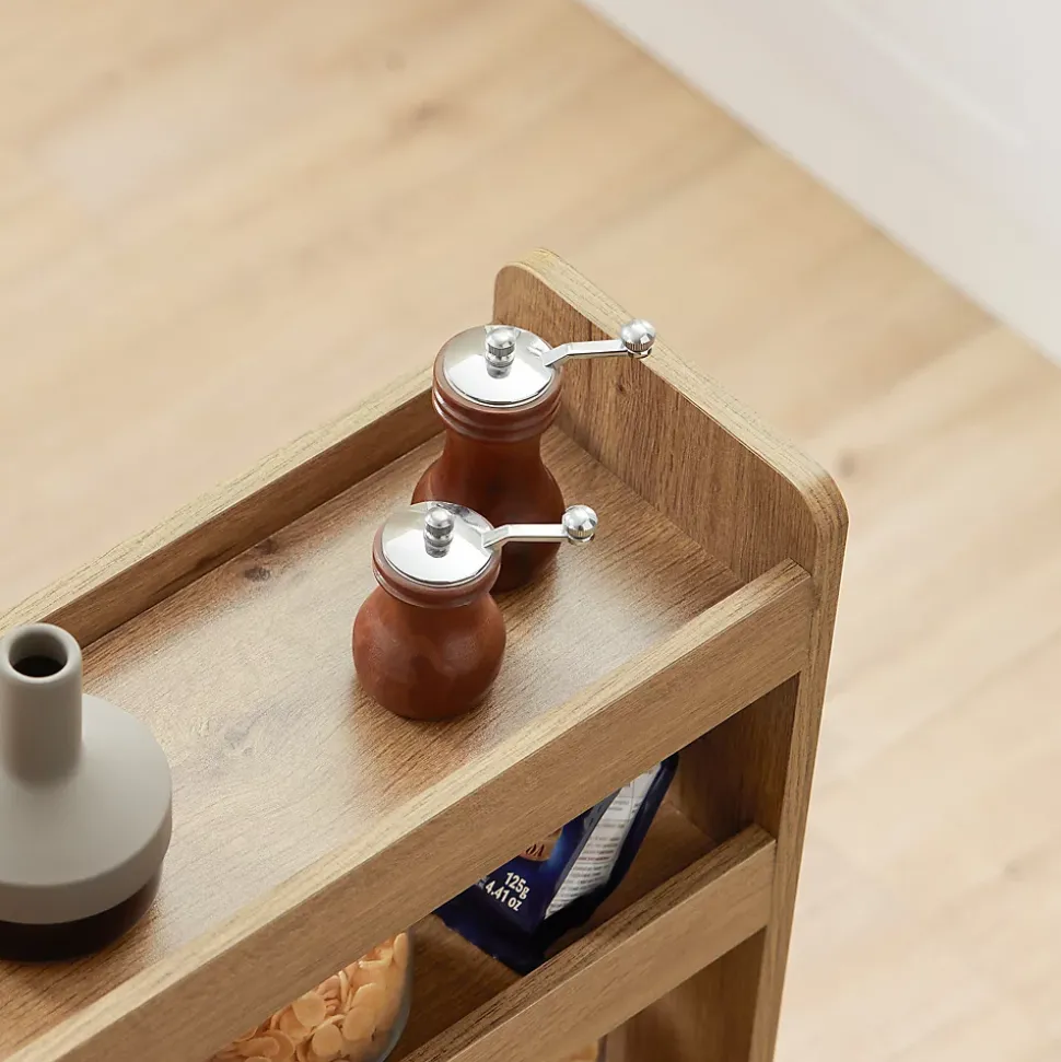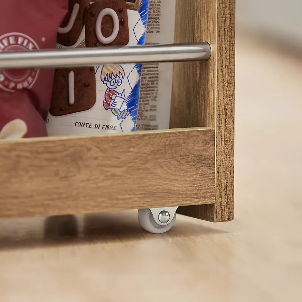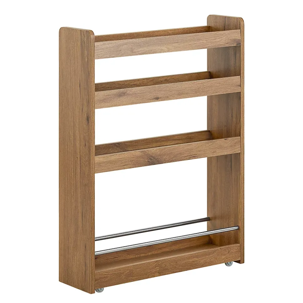 Chariot de niche pratique à glisser dans les espaces étroits à partir de 18 cm. Design élégant et fonctionnel, ce meuble de rangement à roulettes en bois dispose de 4 étages solides pour organiser vos provisions, vaisselle, ustensiles ou boissons.Idéal pour gagner de l’espace dans la cuisine, la salle à manger ou même la salle de bains. Caractéristiques : Matériau : PB (E1) Dimensions : L60 x P18,5 x H81 cm Charge maximale : 20 kg (5 kg par étage) 4 roulettes en plastique robuste pour un déplacement facile Barres latérales anti-chute Montage simple avec notice illustrée incluse Parfait pour les petits recoins et complément de rangement pratique près de la table ou du canapé.