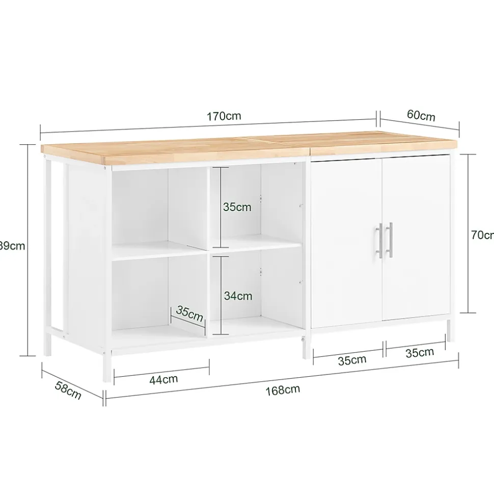 Îlot central de cuisine avec plan de travail en bois d’hévéa, desserte avec 2 portes et 4 compartiments, 170x60x89 cm, blanc Ce meuble polyvalent allie fonctionnalité et esthétique. Son plan de travail spacieux offre une surface de préparation et de repas pratique. Structure semi-ouverte avec rangements pour ustensiles et affichage d’articles. Doté de 2 portes et 4 compartiments modulables, il optimise l’espace pour le rangement de vaisselle. Les étagères derrière les portes sont réglables sur 3 hauteurs ou amovibles. Caractéristiques : Matériaux : MDF, PB et bois d’hévéa Dimensions : 170 x 60 x 89 cm Poids : 58 kg Charge maximale : 92 kg
