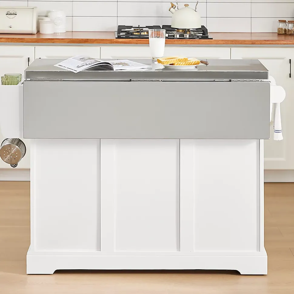Cet îlot de cuisine moderne sur roulettes est fabriqué en PB et MDF, avec un plan de travail en acier inoxydable. Dimensions : 130 x 46-71 x 91 cm. Capacité de charge : 90 kg. Espace de rangement optimisé : 2 tiroirs, une armoire avec étagère réglable et une boîte de rangement pour accessoires culinaires. Équipé d’un porte-serviettes et d’un porte-couteaux à 3 crochets Plan de travail extensible : Le côté rabattable prolonge la surface de 25 cm (de 46 à 71 cm), offrant un espace supplémentaire pour la préparation des repas Mobilité pratique : 4 roues intégrées permettant de déplacer facilement l’îlot selon les besoins Option de tiroir extractible : Permet de ranger une poubelle ou des équipements volumineux comme un mixeur Idéal pour les cuisines compactes, alliant fonctionnalité et esthétique.