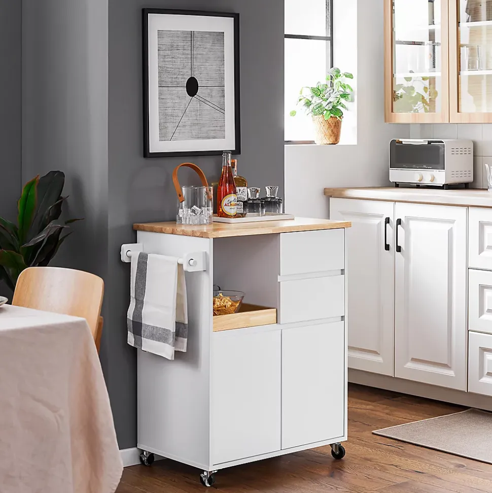 Desserte de cuisine à roulettes SoBuy FKW123-WN Chariot pratique avec plateau amovible, 2 tiroirs et 2 portes. Dimensions : 72x40x84 cm. Coloris blanc. Ce meuble de rangement offre une organisation optimale pour votre cuisine : Plateau spacieux pour la préparation des repas Porte-serviettes et compartiments multiples Tiroirs dédiés aux couverts Portes protégeant de la poussière 4 roues flexibles dont 2 verrouillables 3 hauteurs d’agencement disponibles Caractéristiques techniques : Matériau : MDF Capacité de charge : 76 kg Structure robuste et facile à nettoyer