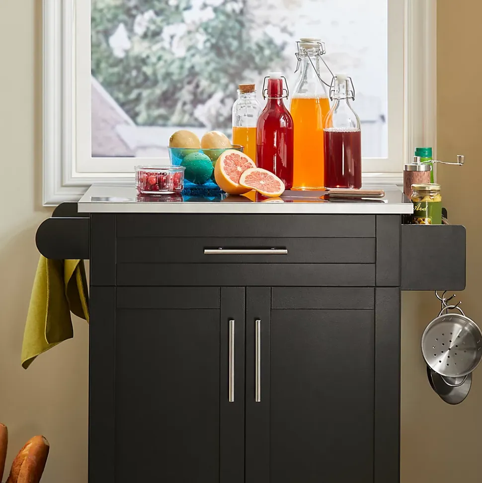 Ajoutez une touche contemporaine dans votre cuisine ce chariot de rangement. Il vous offre de grand espace de rangement pour divers ustensiles dans la cuisine, à la salle a manger, etc. Equipé d’un grand plan de travail en inox, 1 tiroirs, 1 porte-serviette, 1 cahche étagère à épices sur le côté et 1 étagères de rangement réglables en hauteur. Toutes les 4 roulettes pivotent en plastique fonctionnent bien et silencieusement. Deux d’entre elles sont équipées d’un frein. Conception et fabrication en bois de pin et bois MDF classe E1. Dimension(LxHxP): 83 x 46 x 90 cm. Plan de travail : 46 x 61 cm. Capacité de charge jusqu’à 50 kg. Avec la Facture.