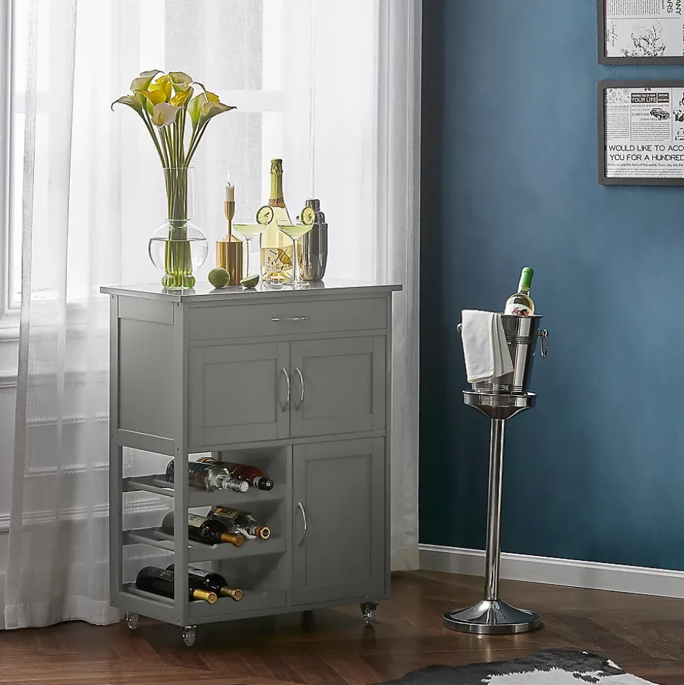 Cette moderne desserte de cuisine à roulettes est super pratique pour ranger vos verres de vin, bouteilles, ustensiles de cuisine, etc.1 grand tiroir pour des ustensiles de cuisine et 2 compartiments avec portes pour des vaisselles, bols, assiettes, etc. 3 porte-bouteilles jusqu’à 9 bouteilles.Matériaux de qualité, en bois MDF(E1), Plateau en Acier INOX.Dimensions: L67cmxH87cmxP38cm.Dimensions du plan de travail : L67cmxP38cm. Capacité de charge: 60kg.Trois couleurs aux choix: FKW45-WN(blanc) / FKW45-SCH(noir) / FKW45-HG(gris). <ul class= »a-un