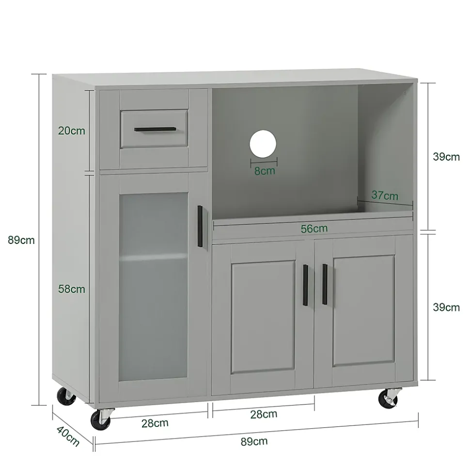 Armoire de cuisine design nordique contemporain gris et 1 porte vitrée : idéale pour ajouter une touche de modernité et d’élégance supplémentaire à votre intérieur.Une niche ouverte fermé et une fermée pour ranger votre four, micro-ondes, grille-pain ou autres petits appareils électroménagers.Avec la notice de montage illustrée et les pièces numérotées, le montage est facile.Deux compartiments fermés et un tiroir pratique pour ranger vos ustensiles, vaisselle ou autres accessoires.Le trou rond à l’arrière de chaque compartiment laisse passer les fils, ce qui cache bien les fils.L’étagère derrière la porte vitrée peut être ajustée à trois hauteurs pour maximiser l’espace de stockage.Avec les 4 roulettes de haute qualité (dont 2 avec freins), vous pouvez placer cette armoire de cuisine là où vous en avez besoin.Détails :Matière : MDF classe E1 et verre.Dimensions : 89 x 40 x 89 cm.Capacité de charge : jusqu’à 60 kg.Poids d’envoi : 30,1 kg.