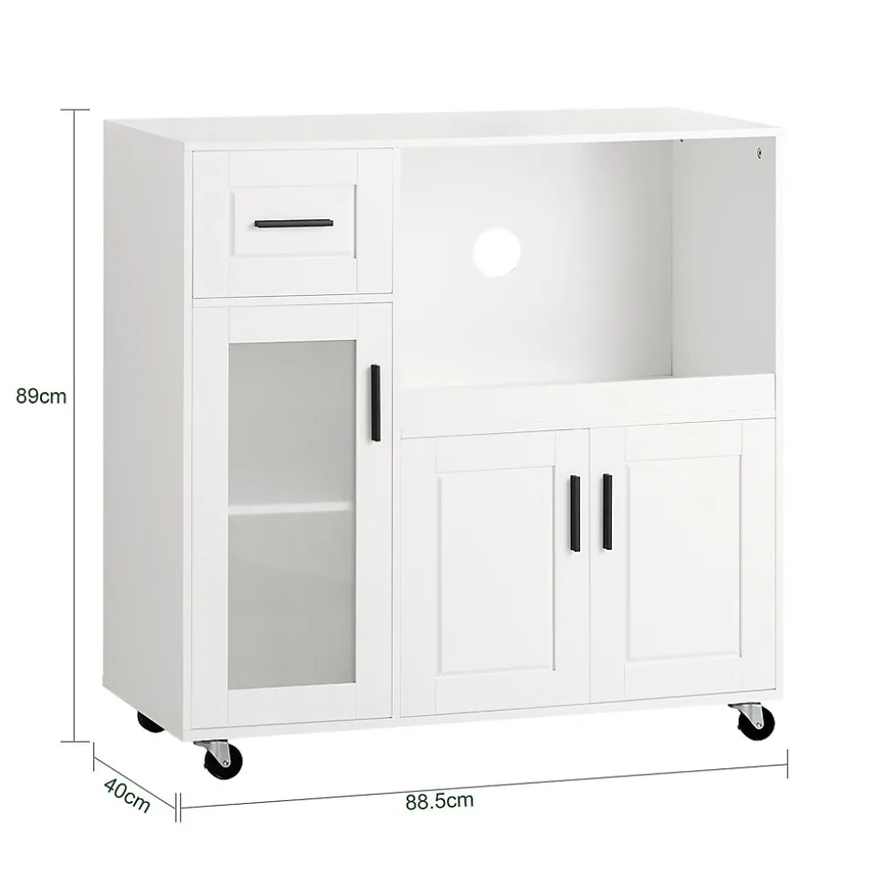 SoBuy FSB78-W Buffet Commode sur Roulettes Meuble Micro-ondes Armoire de cuisine design nordique contemporain et 1 porte vitrée : idéale pour ajouter une touche de modernité et d’élégance supplémentaire à votre intérieur.Une niche ouverte fermé et une fermée pour ranger votre four, micro-ondes, grille-pain ou autres petits appareils électroménagers.Le trou rond à l’arrière de chaque compartiment laisse passer les fils, ce qui cache bien les fils.Deux compartiments fermés et un tiroir pratique pour ranger vos ustensiles, vaisselle ou autres accessoires.L’étagère derrière la porte vitrée peut être ajustée à trois hauteurs pour maximiser l’espace de stockage.Le plateau haut vous offre d’espace supplémentaires pour votre machine à café à capsules, les bougies, les albums photos, etc.Avec les 4 roulettes de haute qualité (dont 2 avec freins), vous pouvez placer cette armoire de cuisine là où vous en avez besoin.Détails:- Matière : MDF classe E1 et verre.- Dimensions : 88,5 x 40 x 89 cm.- Capacité de charge : jusqu’à 60 kg.- Poids d’envoi : 28 kg.