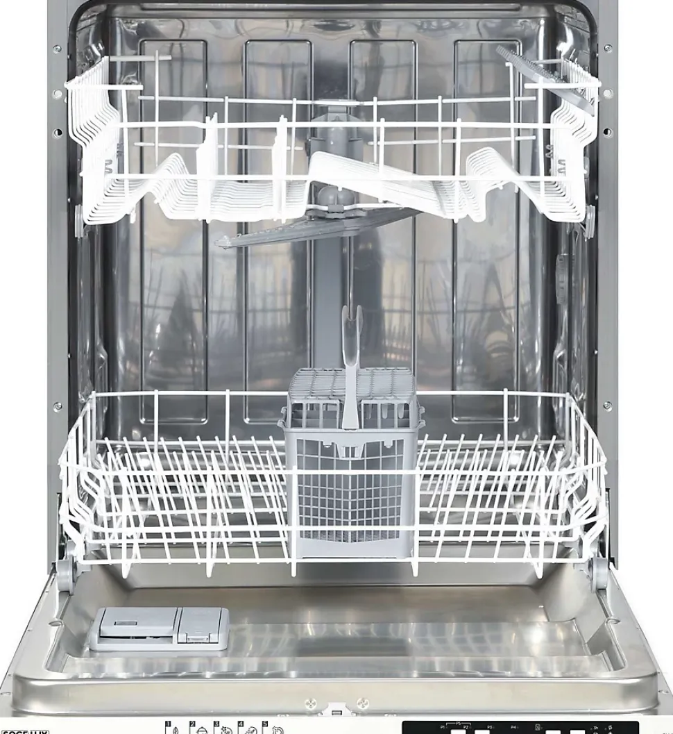 Capacité : 13 couvertsType : full intégrableClasse énergétique : A++Efficacité énergétique : lavage=A / séchage=ATension d’alimentation : 230VConsommation : Eau 12L par cycle, 3360L par anÉlectricité 0,91kWh par cycle, 261kWh par anNiveau sonore : 45dBDimensions :Hors-tout (L)60 x (P)55 x (H)82 à 87 cmPoids 38kgInclus : Notice d’utilisation + cône de remplissage sel + bande test calcaire eau + kit encastrementAutres caractéristiques :5 programmes dont 2 rapides (30mn 40°C et 50mn 65°C)Températures de lavage 40°C – 50°C – 65°C – 70°C Sécurité de chauffage sans eauVoyant de fin de cycle avec buzzer2 voyants (Rinçage + sel)Touche départ différé 3h – 6h – 9hPicots rabattables sur panier inférieur1 panier à couverts2 bras d’aspersionFiltre InoxRéglage de l’adoucisseur (suivant la dureté de l’eau)Réglage des pieds avec 1 seule vis à l’avant