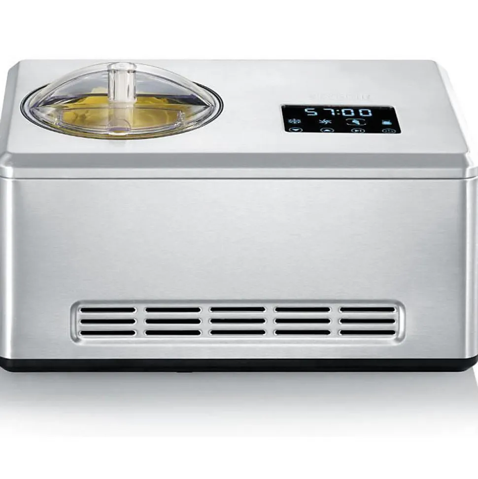 Sorbetière Severin EZ7406 polyvalente avec fonction yaourtière, compresseur pour refroidissement actif sans pré-refroidissement, écran tactile et minuterie intégrée. Inclut accessoires et livre de recettes.