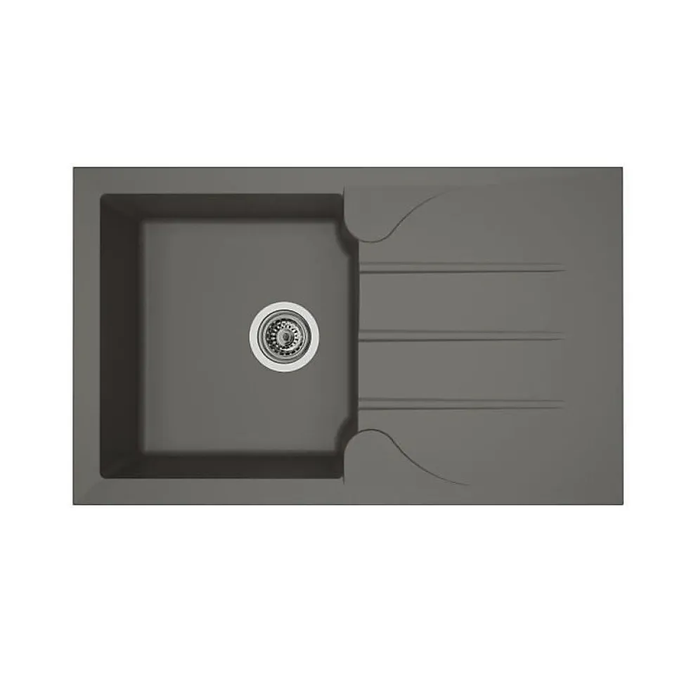 Évier de cuisine STRADOUR Aloa en résine gris béton, résistant à la chaleur, avec 1 bac rectangulaire et égouttoir réversible, vidage manuel Ø90 mm inclus, bord d’encastrement plat et découpes décoratives entre bac et égouttoir ; fabriqué en France et certifié EN13310 & EN 695, garanti 2 ans.