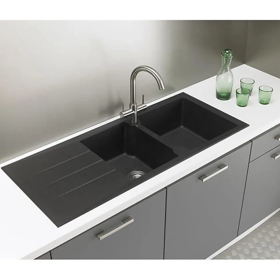 - Evier encastré en résine noir mat avec 2 bacs profonds et 1 égouttoir réversible.