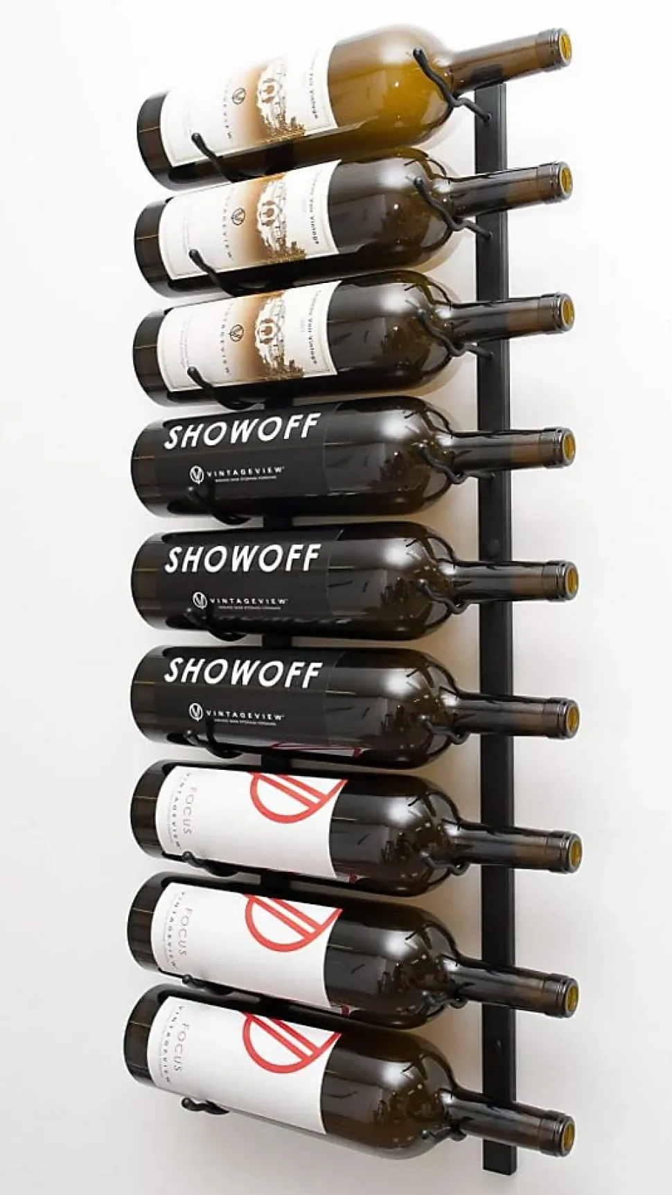 Support à bouteilles de vin VintageView en métal noir double profondeur. La série MAG2 est un support à magnums mural de 9 bouteilles de haut par 2 bouteilles de profond (1500ML) qui transforme n’importe quel mur, aussi petit soit-il, en design moderne de présentations de bouteilles de vin de type magnum. Hauteur de 114.5 cm, Largeur 38cm et profondeur 25.5cm.