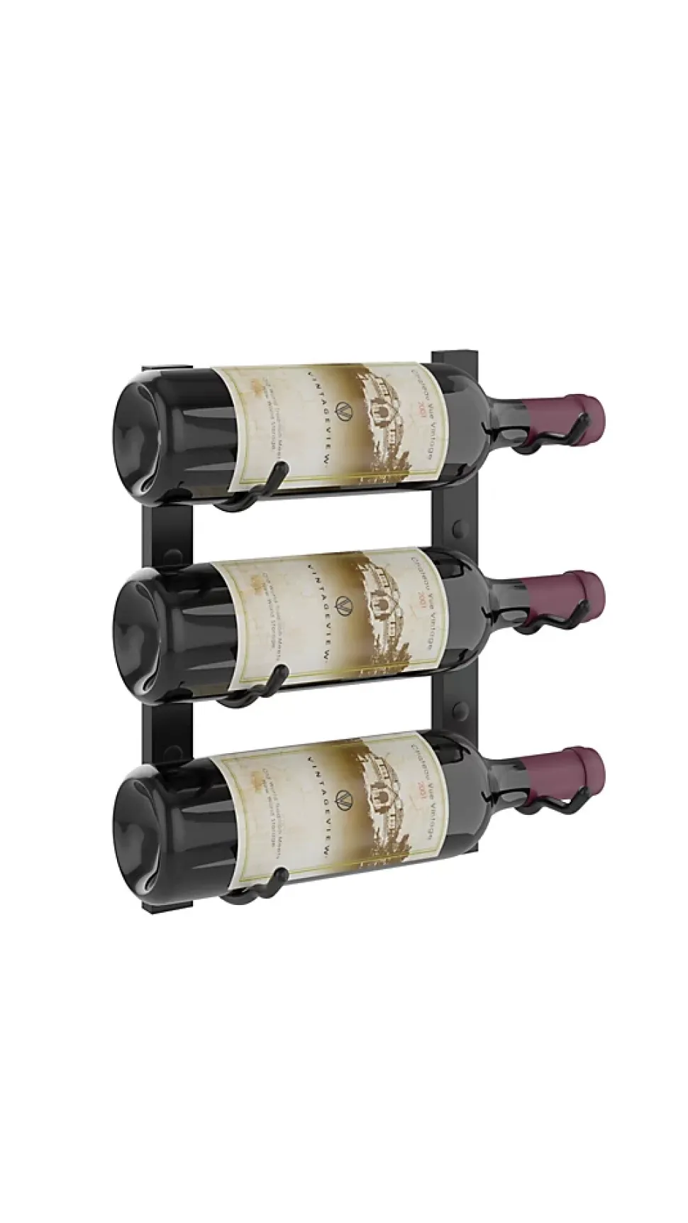 Support à bouteilles de vin VintageView en métal noir simple profondeur. La série W1 est un support à bouteilles de vin mural de 3 bouteilles de haut qui transforme n’importe quel mur, aussi petit soit-il, en design moderne de présentations de bouteilles de vin. Hauteur de 30.5, Profondeur 11 et largeur de 33cm avec la bouteille.