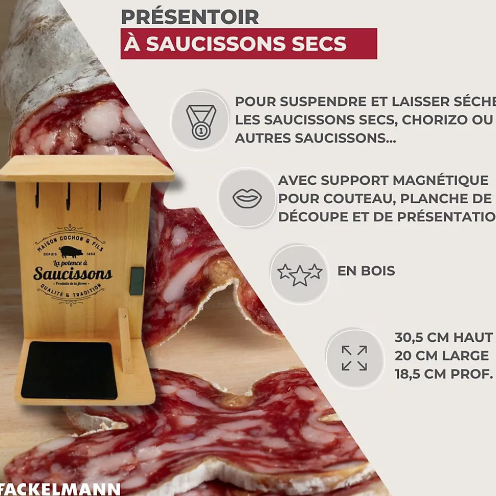 - DESCRIPTION : Fackelmann vous propose cette potence à saucissons, idéale pour une présentation originale de vos saucissons, de plus grâce à sa base renforcée, vous pouvez découper votre saucisson directement sur votre support