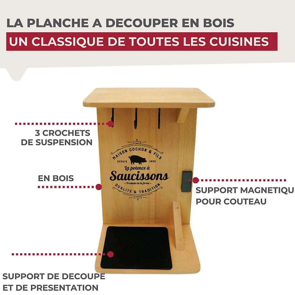 - LE PETIT + : Il est possible d’accrocher votre couteau à saucisson au support, grâce à l’aimant accroché sur la planche en bois, vous pourrez donc à tout moment découper et déguster votre saucisson