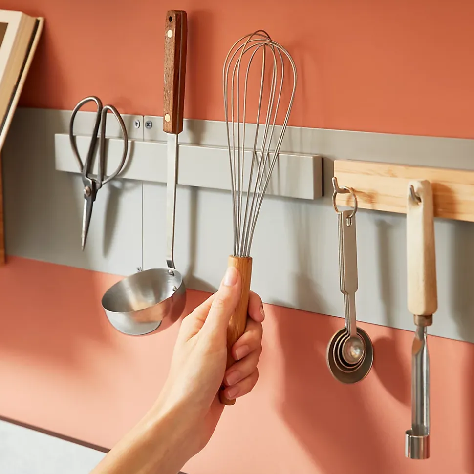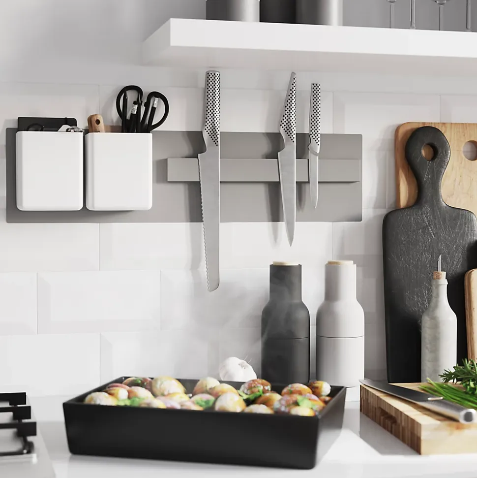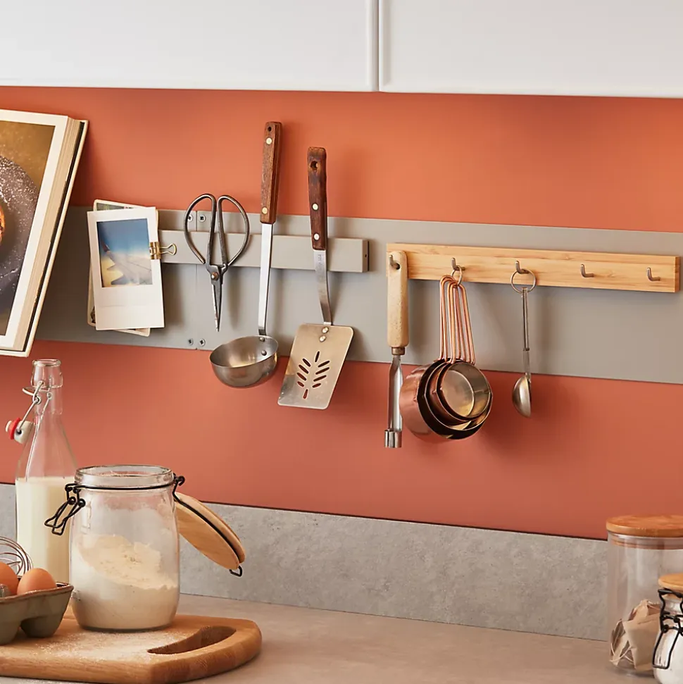 Personne n’aime fouiller dans le tiroir à couvert en essayant de trouver le bon ustensile. Ce tableau magnétique vous permet d’exposer les ustensiles que vous utilisez le plus pour qu’ils soient à portée de main quand vous en avez besoin. Installez-le entre votre plan de travail et vos meubles hauts et ajoutez des accessoires Pecel pour conserver ce dont vous avez besoin à portée de main