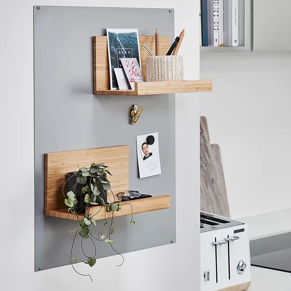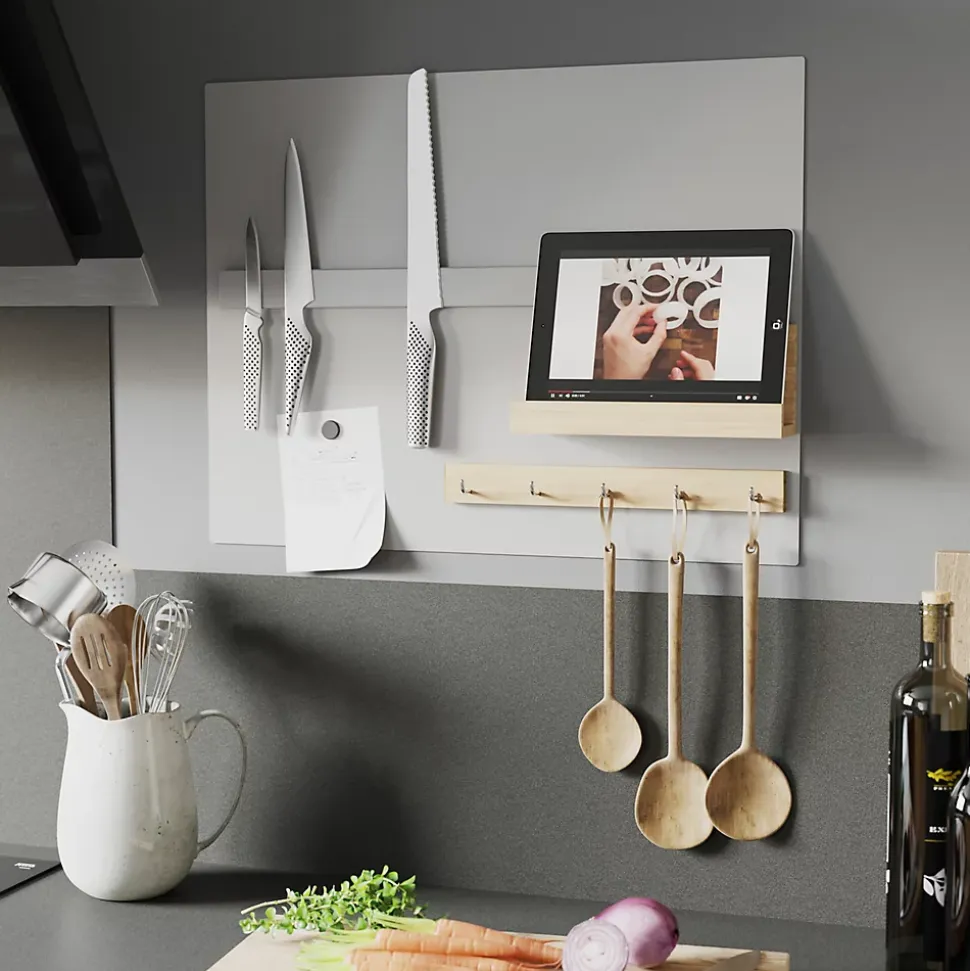 Personne n’aime fouiller dans le tiroir à couvert en essayant de trouver le bon ustensile. Ce tableau magnétique vous permet d’exposer les ustensiles que vous utilisez le plus pour qu’ils soient à portée de main quand vous en avez besoin. Installez-le entre votre plan de travail et vos meubles hauts et ajoutez des accessoires Pecel pour conserver ce dont vous avez besoin à portée de main