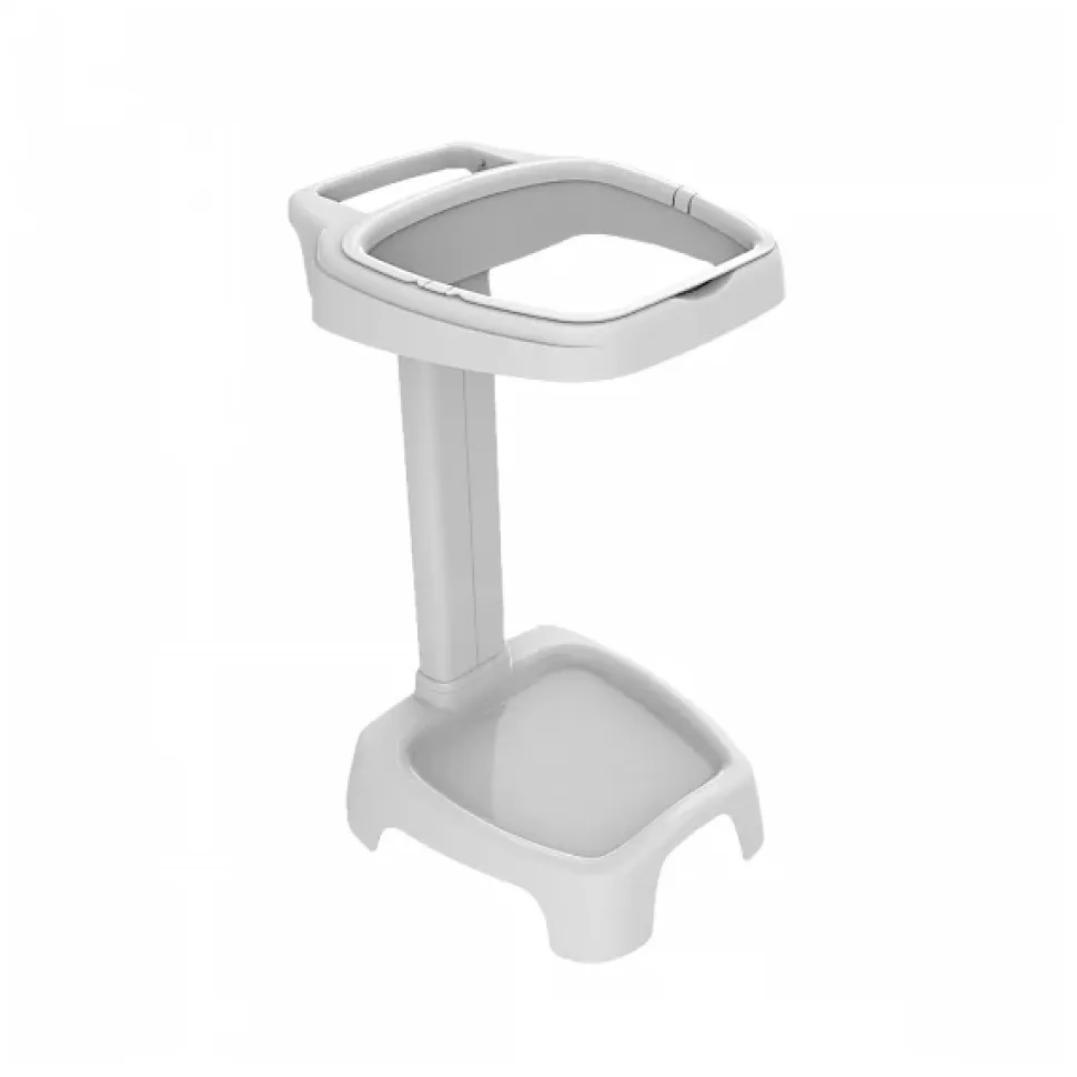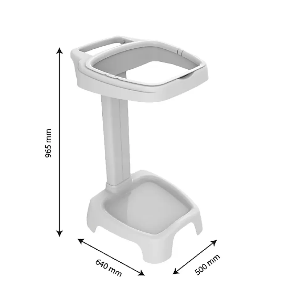 Support sac sans roues, sans pédale ni couvercle. Mise en place et extraction du sac très facile. La poignée droite, à l’arrière, permet un meilleur positionnement contre les murs. Support sac livré à assembler.