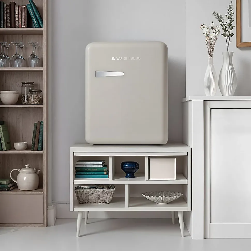Le mini bar au design vintage WEISS a tout pour vous plaire ! Grâce à son format ultra compacte, il s’adapte à tous vos espaces. D’une capacité de 31 L, ce mini bar comprend une clayette et 2 compartiments de rangement dans la porte. Grâce à son thermostat réglable, ajustez la température à vos besoins, entre 6 et 15°C. Son design retro fait de lui un immanquable pour votre intérieur. Sa poignée chromée et des bords arrondis lui donnent un style élégant. Chez vous, dans une chambre d’hôtel ou au bureau, gardez toujours vos boissons au frais avec la gamme WEISS !CARACTÉRISTIQUES :Capacité : 31 L Hauteur : 54 cm Design vintage Capacité de refroidissement : 6 – 15℃ Thermostat réglable Pieds réglables Niveau sonore : 24dB Compact Accessoire : poignée Classe énergétique : E Puissance : 58W