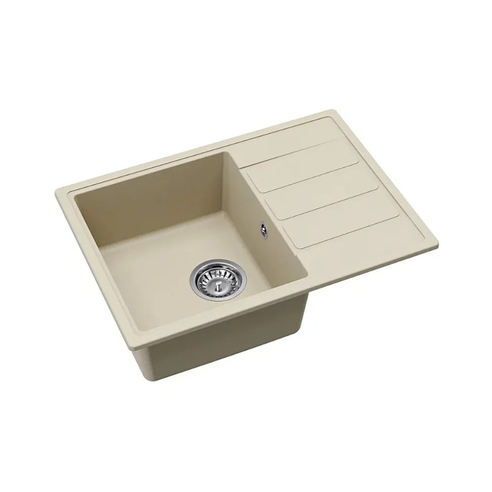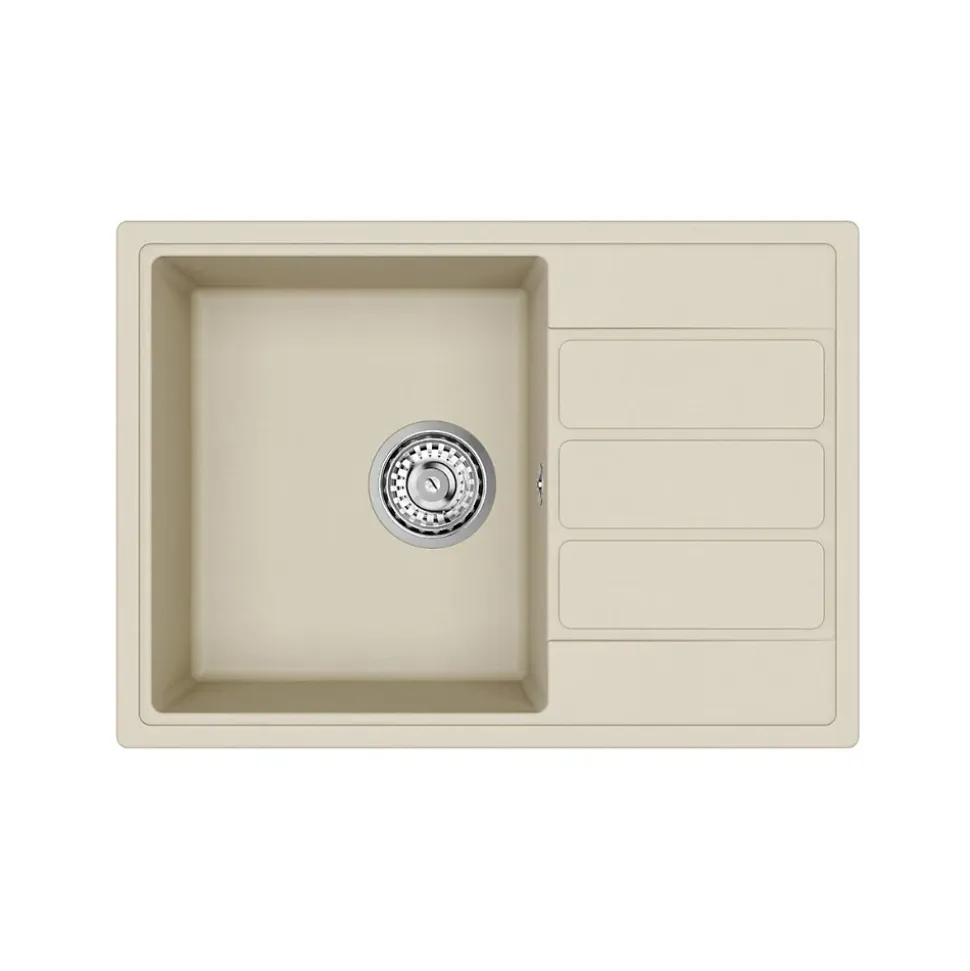 Caractéristiques de l’Evier 62×44 cm avec égouttoir réversible en Granite, à encastrer, Jasmin (SATSINKGE2J) :Coloris : JasminMatière : Granite Sous-meuble : 45 cm Dimensions de l’évier : 62×44 cmDimensions de la découpe : 60×42 cm Dimensions de la cuve : 33x38x17 cmEgouttoir réversible 2 trous pour robinetterie pré-percésTrop plein inclus Bonde, siphon, accessoires de montage compris;
