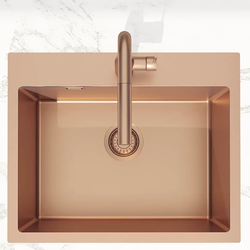 Caractéristiques de l’évier à encastrer en acier inoxydable 304, 55x45x21 cm, avec trop plein, cuivre brossé PVD (SATSINK5545BRG):Matière: Acier inoxydable 304Coloris : Cuivre brosé PVDDimensions: 55x45x21 cmÉpaisseur : 1,5 mmType d’installation : À encastrerAvec trop pleinTrou percé pour robinetterieDiamètre de la bonde : 90mmLivré sans siphon