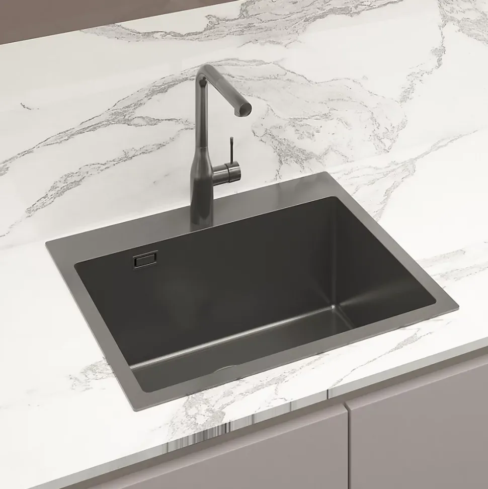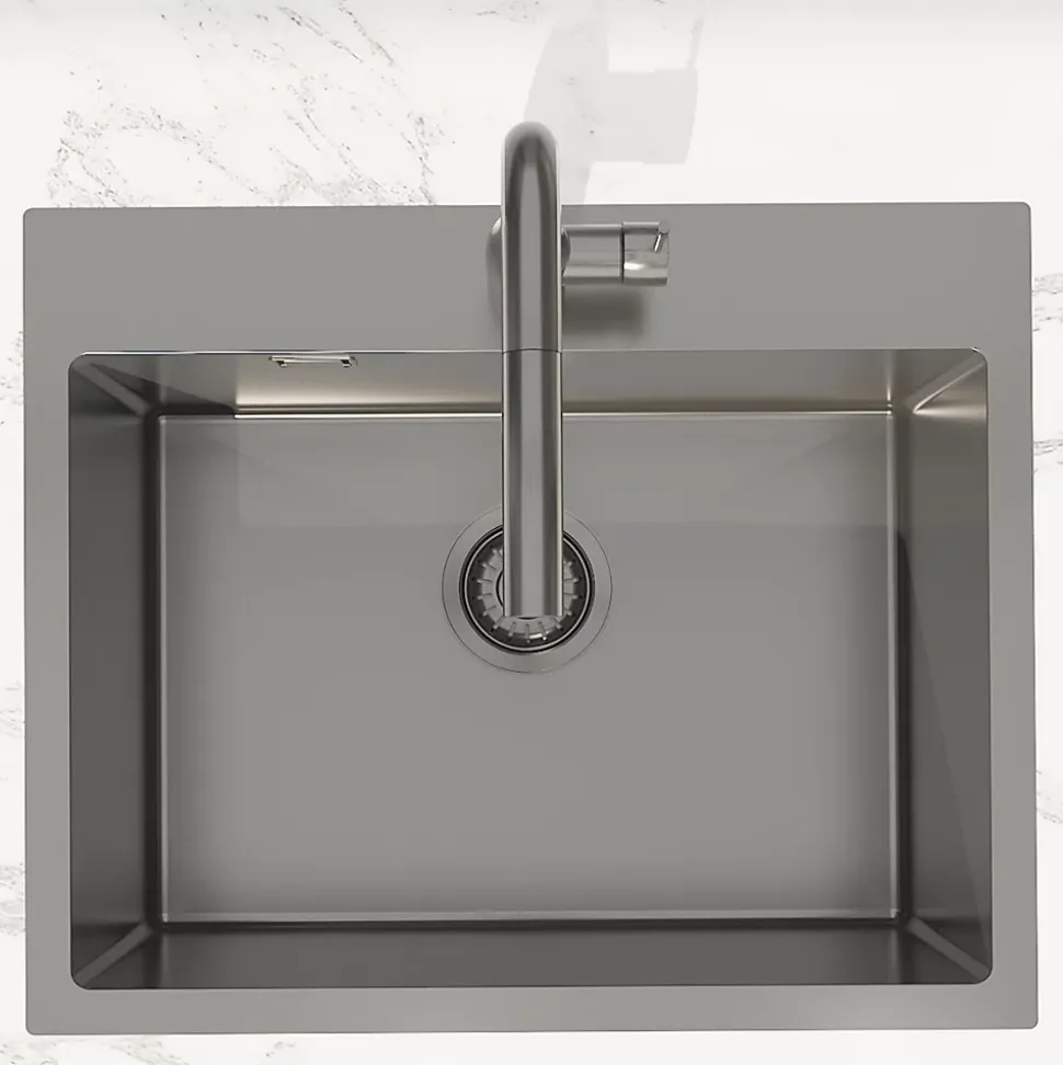 Caractéristiques de l’évier à encastrer en acier inoxydable 304, 55x45x21 cm, avec trop plein, Gun Metal PVD (SATSINK5545BGM):Matière: Acier inoxydable 304Coloris : Gun Metal PVDDimensions: 55x45x21 cmÉpaisseur : 1,5 mmType d’installation : À encastrerAvec trop pleinTrous percé pour robinetterieDiamètre de la bonde : 90mmLivré sans siphon