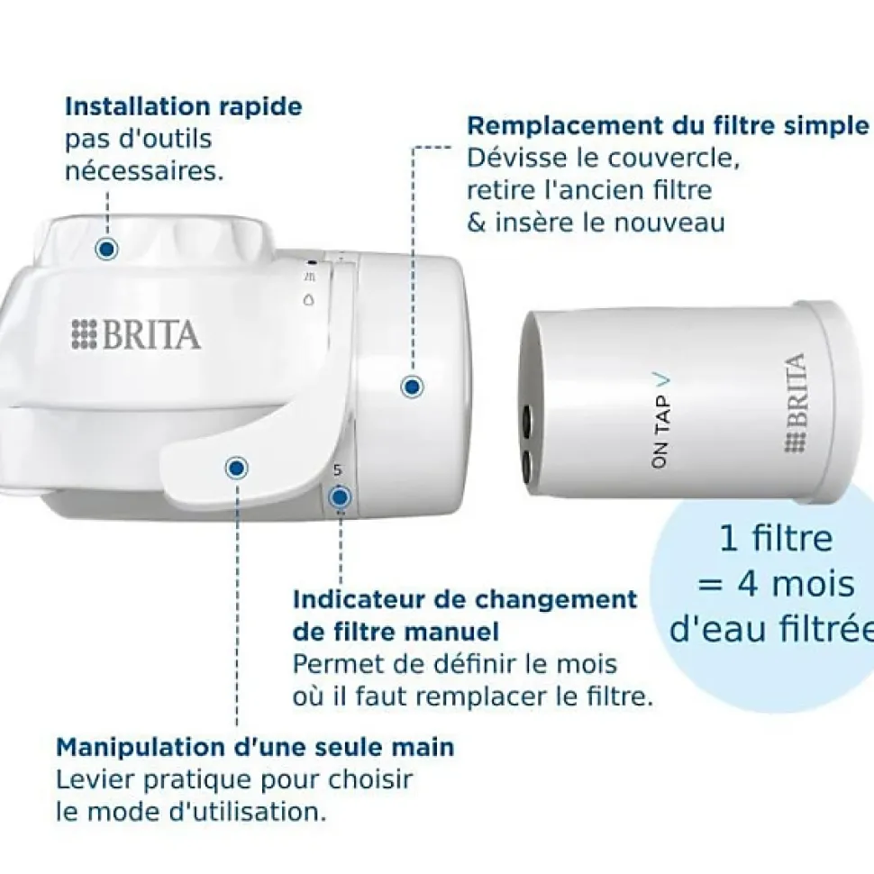 Le systeme de filtration sur robinet ON TAP V de BRITA offre une solution pratique pour obtenir de l’eau propre directement de votre robinet de cuisine. Avec une capacité de 600 litres par filtre (environ 4 mois) et cinq adaptateurs inclus, il permet d’éviter jusqu’a 1200 bouteilles en plastique par an.