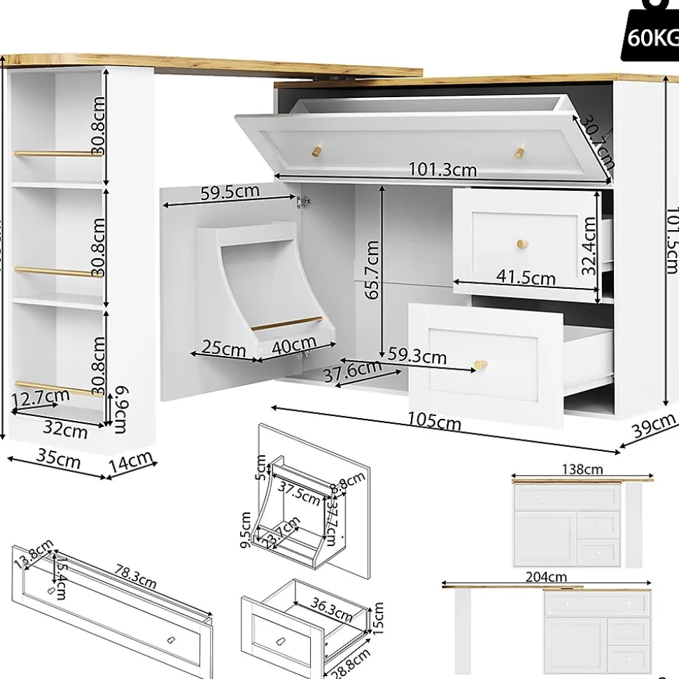 Caractéristiques du produitDesign raffiné : matériau MDF de haute qualité, portes d’armoire tridimensionnelles élégantes et plateau de table aux motifs raffinés, rehaussé de charmantes poignées métalliques – un signe d’un savoir-faire artisanal exceptionnel.Espace de rangement multifonctionnel : étagère à snacks unique vers le haut, rangement intégré dans la porte de l’armoire et deux tiroirs rabattables offrant de nombreuses possibilités de rangement pour différents besoins.Plateau tournant à 360 degrés : sûr et stable, le plateau tournant permet une rotation libre à 360 degrés pour un accès facile aux objets et plus de confort.Utilisations polyvalentes : idéal pour les restaurants, les salons, les bureaux et plus encore, parfait pour les soirées conviviales ou les pauses détendues au travail.Conception innovante à abattant : la construction à abattant peu encombrante allie modernité et fonctionnalité, pour un mariage harmonieux entre esthétique et praticité.Dimensions de l’emballageSous-article 1 : 152,4 * 47,63 * 15,88 cm 28,05 kgSous-article 2 : 120,02 * 67,95 * 13,97 cm 28,8 kgDétails du produitDimensions du produit 138-204*39*105 cmPoids du produit 52,85 kg/tableMatériau MDF, métalPoids supporté 60 kg/tableAssemblage requis 30 minutesContenu de la livraison 1x table de bar avec instructions de montage et matériel d’assemblageNombre de colis 2Pays d’origine ChineCouleur principale : blancMatériau principal : MDF + métal