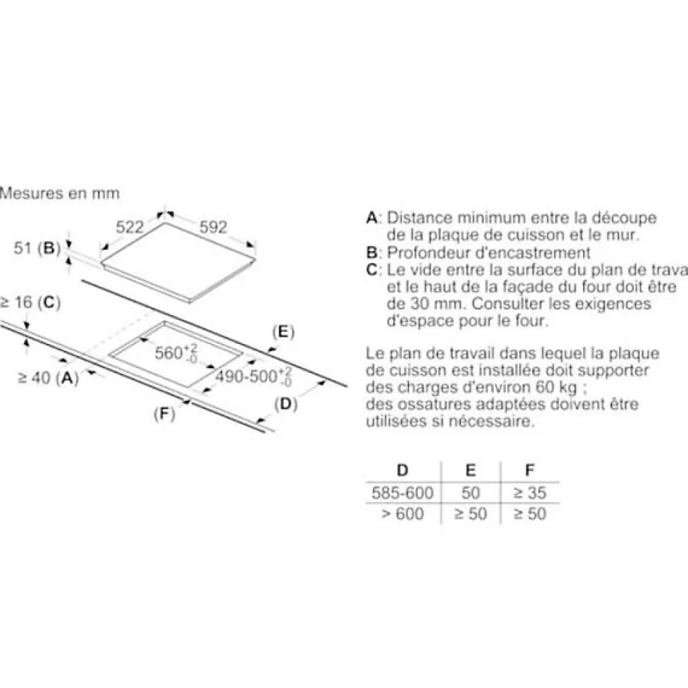 Table de cuisson à induction 60cm 3 feux 4600w Bosch – Table de cuisson à induction Série 2 Bosch PUC611AA5E pour cuisiner vite, en toute sécurité et avec une faible consommation en énergie. PowerBoost : atteignez l’ébullition en un temps record. Sécurité enfant : le bandeau est bloqué évitant tout changement de programmation non souhaité. Table induction : rapide, précis, facile à nettoyer avec une faible consommation d’énergie. QuickStart : détection automatique des casseroles sur la table de cuisson. – Type de produit : Table de cuisson à induction.Gamme : Série 2.Type de plaque : Induction.Type d’encastrement : A recouvrement plan de travail.Energie : Electricité.Hotte intégrée : Non.Nbre foyer(s) : 3.Touche(s) sensitive(s) : Oui.Type de commande(s) : Tactiles.Position des commandes : Frontale.Zone de cuisson modulable (flex) : Non.Foyer le + puissant (W) : 2 200.Foyer le + puissant avec booster (W) : 3 100.Matière de la surface : Vitrocéramique.Type de cadre : Sans cadre.Couleur : Noir.Connecté : Non.Nbre de positions de cuisson : 9.Booster(s) : Oui.Nbre de booster(s) : 3.Autre(s) fonction(s) : QuickStart, QuickStop.Verrouillage des commandes / Sécurité enfant : Oui.Anti-surchauffe : Oui.Autre(s) sécurité(s) : Interrupteur principal.Puissance de raccordement (W) : 4600.Longueur du cordon (m) : 1.1.Hauteur (cm) : 5.1.Largeur (cm) : 59.2.Profondeur (cm) : 52.2.Encastrement H x L x P (cm) : 5.1 x 56 x 49-50.Poids (kg) : 10.66.