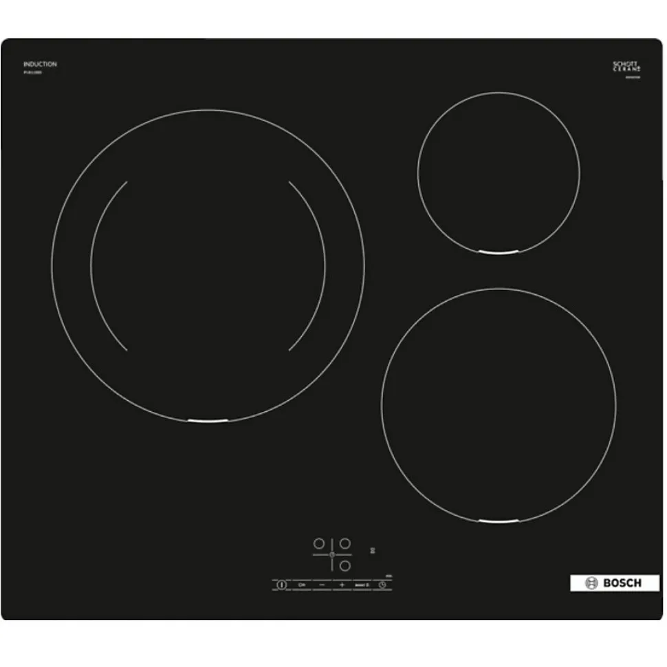 Table de cuisson à induction 60cm 3 feux noir Bosch – Table de cuisson à induction Série 4 Bosch PIJ611BB5E pour cuisiner vite, en toute sécurité et avec une faible consommation en énergie. TouchSelect : facilité de sélection de la zone de cuisson et des niveaux de puissance. PowerBoost : jusqu’à 50 % de puissance en plus pour des plaques à induction plus efficaces. Timer avec fonction arrêt : désactive la zone de cuisson selectionnée une fois le temps programmé arrivé à échéance. Sécurité enfant : le bandeau est bloqué évitant tout changement de programmation non souhaité. Table induction : rapide, précis, facile à nettoyer avec une faible consommation d’énergie. – Type de produit : Table à induction.Gamme : Série 4.Type de plaque : Induction.Type d’encastrement : A recouvrement plan de travail.Energie : Electricité.Hotte intégrée : Non.Nbre foyer(s) : 3.Touche(s) sensitive(s) : Oui.Type de commande(s) : TouchhSelect.Position des commandes : Frontale.Zone de cuisson modulable (flex) : Non.Foyer le + puissant (W) : 2 600.Foyer le + puissant avec booster (W) : 3 700.Matière de la surface : Vitrocéramique.Type de cadre : Sans cadre.Couleur : Noir.Finition / Nuance : Verre.Connecté : Non.Nbre de positions de cuisson : 17.Booster(s) : Oui.Nbre de booster(s) : 3.Minuterie : Oui.Autre(s) fonction(s) : QuickStart, ReStart, QuickStop.Témoin(s) de chaleur résiduelle : Oui.Verrouillage des commandes / Sécurité enfant : Oui.Anti-surchauffe : Oui.Autre(s) sécurité(s) : Interrupteur principal.Puissance de raccordement (W) : 7400.Tension (V) : 220-240.Fréquence (Hz) : 50/60.Longueur du cordon (m) : 1.1.Diamètre du + grand foyer (cm) : 28.Hauteur (cm) : 5.1.Largeur (cm) : 59.2.Profondeur (cm) : 52.2.Encastrement H x L x P (cm) : 5.1 x 59.2 x 52.2.Poids (kg) : 12.2.