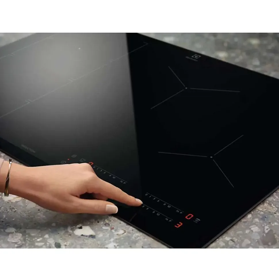 Table de cuisson à induction 60cm 4 feux 7200w noir Electrolux – Table de cuisson induction Série 700 SenseBoil Electrolux EIS62443. Les plaques à induction SenseBoil sont équipées de capteurs qui détectent l’ébullition de l’eau dans vos casseroles et ajuste la température évitant le bouillonnement et maintient l’eau à la température de frémissement. Grâce au système Hob2Hood, plus besoin de régler votre hotte, la plaque de cuisson s’occupe de tout. Une fois la plaque active, l’éclairage de la hotte s’enclenche et les capteurs thermique adaptent la puissance d’aspiration. Ajustez facilement les réglages de température de votre plaque de cuisson avec les touches sensitives à accès directes. Chaque zone de cuisson peut être contrôlée individuellement et vous permet de régler instantanément un niveau de cuisson optimal. Les zones de cuisson Infinite s’adaptent à la taille de vos récipients dès que vous les posez dessus. Ces zones offrent une couverture totale, quelle que soit la taille du récipient, pour offrir la chaleur nécessaire, sans perte de performances. La fonction Booster de cette plaque de cuisson est idéale pour chauffer en un temps record. – Type de produit : Table de cuisson Induction.Série 700 SENSE.4 foyers.Connection H²H.Bandeau de commandes Frontal.Commandes individuelles sensitives avec accès direct.Fonction SenseBoil.4 boosters.4 minuteurs.Foyer AVG Induction : 2300/3700W/210mm.Foyer ARG Induction : 1800/2800W/180mm.Foyer AVD Induction : 1400/2500W/145mm.Foyer ARD Induction : 1800/2800W/180mm.Fonction Pause Stop & Go.Fonction indicateur temps écoulé.Verrouillage des commandes.Arrêt automatique.Détection des casseroles.Anti-débordement.Anti-surchauffe.Sécurité enfants.Bord biseauté en façade.Installation Optifix™.Power management.Nombre de zones de cuisson : 4.Table : Induction.Niveaux de puissance :