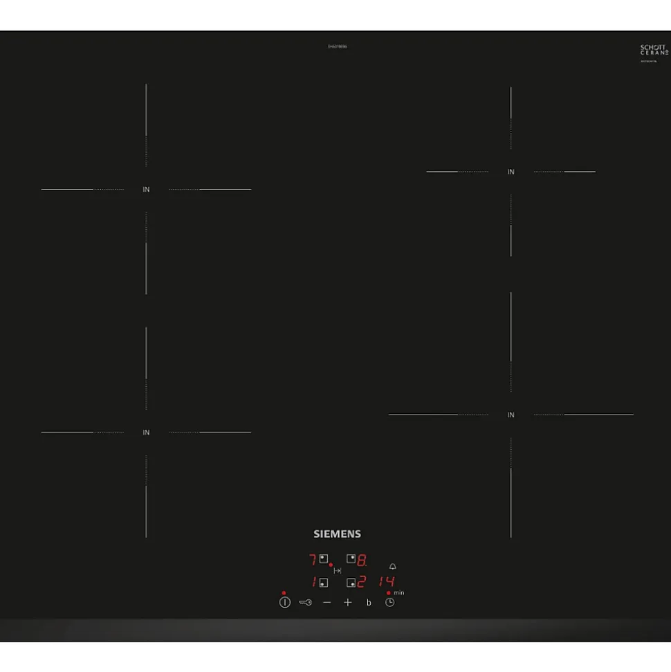 Table de cuisson à induction 60cm 4 foyers 7400w noir Siemens – Table de cuisson iQ100 EH631BEB6E de SIEMENS à induction, une technologie innovante qui diminue vos temps de cuisson, vous facilite le nettoyage et vous offre plus de sécurité. La sécurité enfants bloque toutes les fonctions, prévenant un allumage accidentel. Minuterie avec coupure automatique : la zone de cuisson se coupe automatiquement lorsque le temps de cuisson est écoulé. Fonction powerBoost : jusqu’à 50 % de puissance en plus sur une zone à induction. Le bandeau touchControl permet de contrôler très précisément chacune des quatre zones de cuisson. – Type de produit : Table de cuisson à induction.Gamme : iQ100.Type de plaque : Induction.Type d’encastrement : A recouvrement plan de travail.Energie : Electricité.Hotte intégrée : Non.Nbre foyer(s) : 4.Touche(s) sensitive(s) : Oui.Type de commande(s) : Bandeau TouchControl.Position des commandes : Frontale.Zone de cuisson modulable (flex) : Non.Foyer le + puissant (W) : 2 200.Foyer le + puissant avec booster (W) : 3 700.Matière de la surface : Vitrocéramique.Type de cadre : Sans cadre.Bord(s) biseauté(s) : Oui (avant).Connecté : Non.Nbre de positions de cuisson : 17.Booster(s) : Oui.Minuterie : Oui.Autre(s) fonction(s) : QuickStop, QuickStart, Restart.Témoin(s) de chaleur résiduelle : Oui.Verrouillage des commandes / Sécurité enfant : Oui.Anti-surchauffe : Oui.Autre(s) sécurité(s) : Interrupteur principal.Puissance de raccordement (W) : 7400.Tension (V) : 220-240.Fréquence (Hz) : 50/60.Longueur du cordon (m) : 1.1.Finition / Nuance : Verre.Couleur : Noir.Dimensions (cm) : 5.1 x 59.2 x 52.2.Encastrement H x L x P (cm) : 5.1 x 56 x 49-50.Poids (kg) : 11.9.